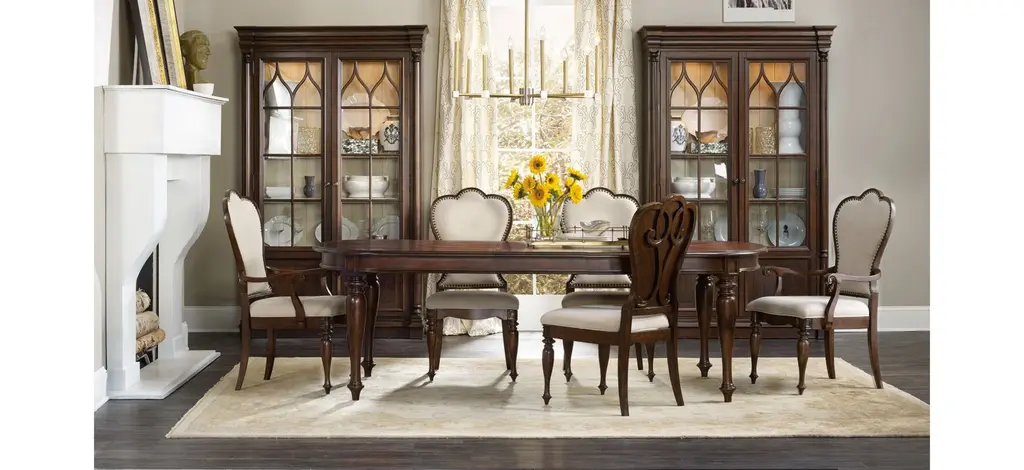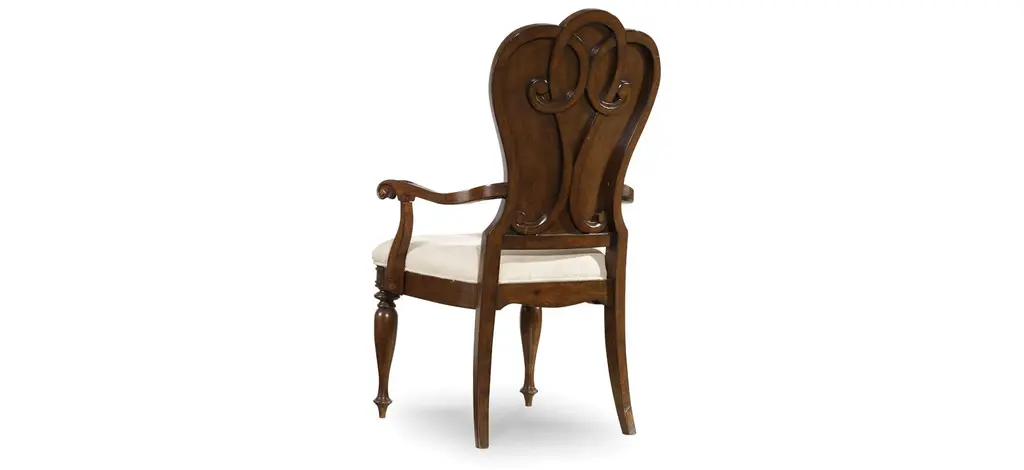 A sculptured, striking silhouette with inviting alabaster-colored fabric on the front and seat, a carved, swirled ribbon-motif wood back, the Leesburg Upholstered Arm Chair gives a fashion flair to classic style. Crafted of exquisite Mahogany Veneers, the chair features a rich finish with elegant cathedral and swirl mahogany veneers with light physical distressing for a casual appeal. Seat and back upholstery is a cotton-polyester blend.