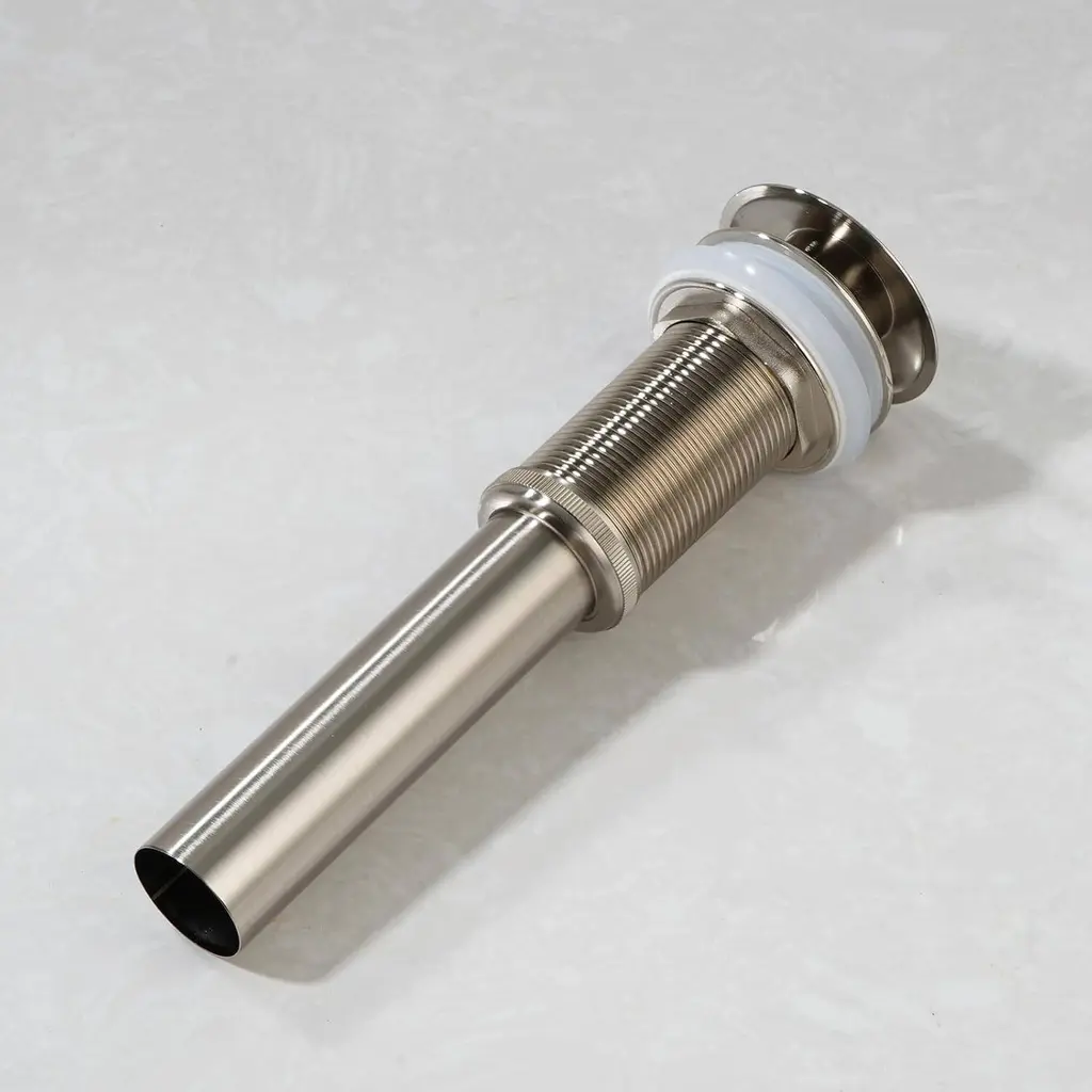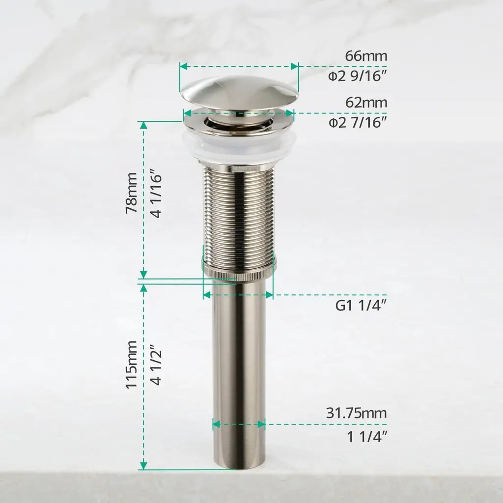 Rustproof & Durable: Made of brass and 304 stainless steel, with no plastic components, ensuring long-lasting durability. High-quality finish provides resistance to scratches, corrosion, and tarnishing, offering excellent rustproof performance. Solid Metal Structure: Constructed with explosion-proof, crack-resistant thickened brass and premium 304 stainless steel, ensuring a sturdy and durable build. Multiple Anti-Leakage Design: Equipped with high-quality thickened silicone gaskets that are oxidation-resistant and provide a better fit for the drain. Features a 3-piece sealing ring design to effectively prevent water leakage. Non-Overflow Drain Assembly: Compatible with most vessel or undermount sinks without overflow. Drain hole diameter: 1.26 inches to 1.9 inches. Dimensions: Overall length: 8.25 inches. Pop-up stopper diameter: 2.56 inches. Tailpiece nut diameter: 1.25 inches.