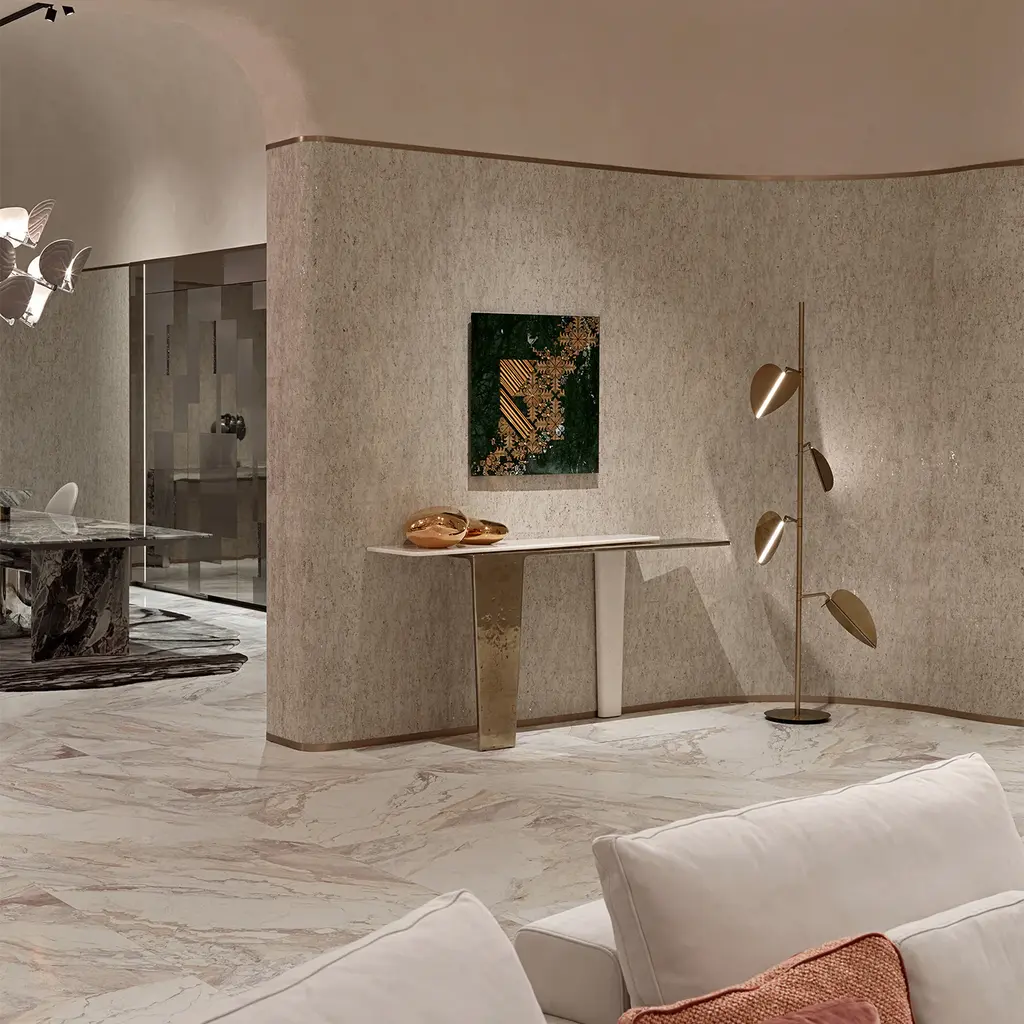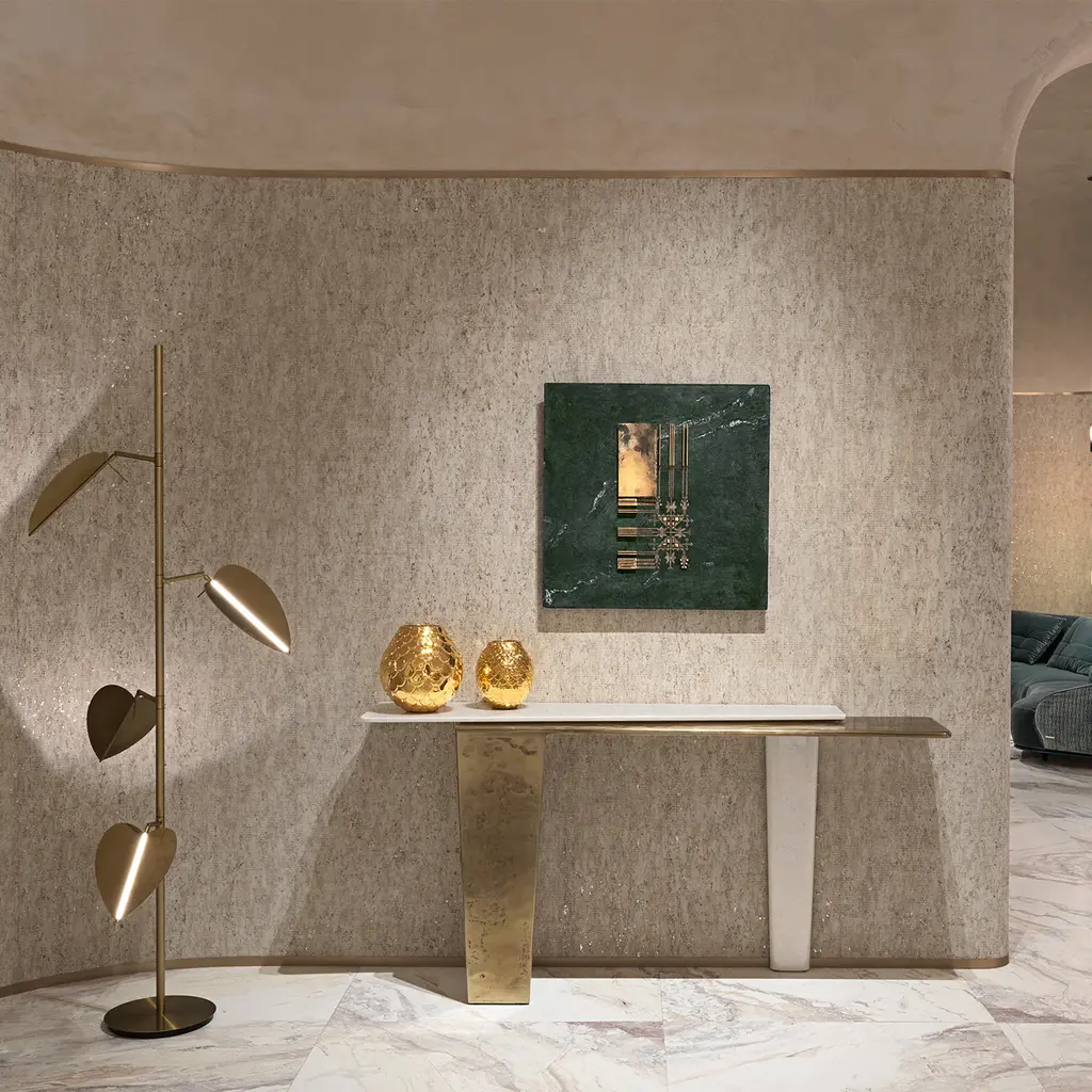 The Lego tall, designed by Draga&Aurel narrow console features a striking structure in cast aluminum with a hand-polished gold finish. Supported by two legs at opposite ends, its minimalist design is both elegant and functional. The top, crafted from luxurious Vasilia T white marble, adds a refined contrast to the golden base, making it a sophisticated statement piece for any space.
