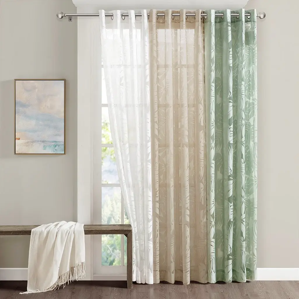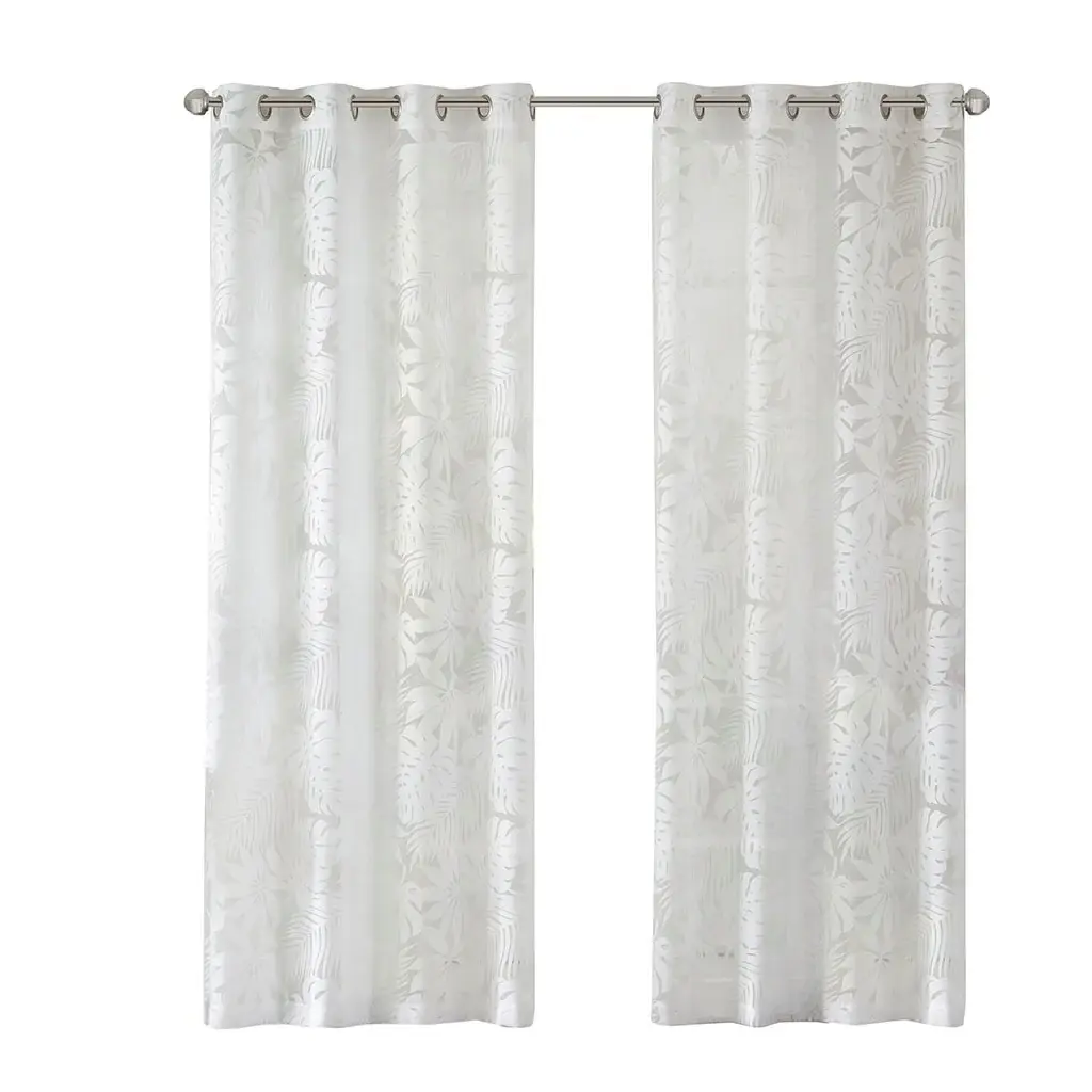 Bring a touch of paradise into your home, with our Madison Park Leilani Palm Leaf Sheer Window Curtain. This panel combines an intricate burnout palm leaf design on a lightweight sheer, creating soft dimension for a relaxed and updated look. This window panel is also OEKO-TEX certified, meaning it does not contain any harmful substances or chemicals, ensuring quality comfort and wellness. The antique silver grommet top finish makes this window curtain easier to hang, open, and close throughout the day. Fits up to a 1.25" diameter rod.