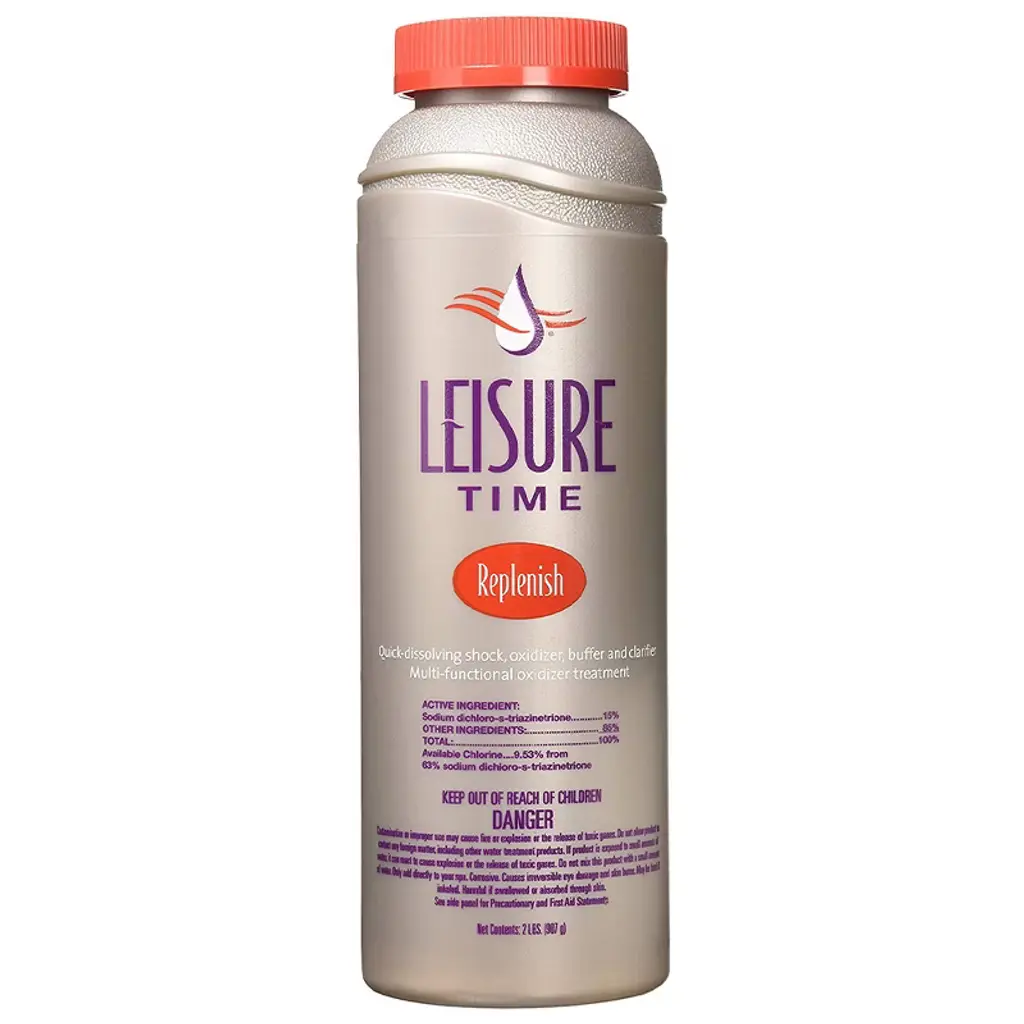Leisure Time Renew Shock Renew is a non-chlorine shock oxidizer. This fast-dissolving granular oxidizer rids spa water of residual soaps, deodorants, natural oils and organic materials that can build up in spa water. When Renew is added to the spa water, it reacts with the bromide and forms a bromine solution to destroy any microorganisms left behind by the bather. Features: Quickly dissolves in water to rid spa water of oils and residue Eliminates organic materials that cause odors, skin and eye irritation Use spa minutes after application. pH buffered so use does not affect pH level. Potassium monopersulfate compound formulated with DuPont Oxone Destroys microorganisms, soaps, deodorants and oils Buffered to prevent pH fluctuations Prevents chloramine build up Brand: Leisure Time Model: RENU2 Dimensions: By Size Weight: By Size