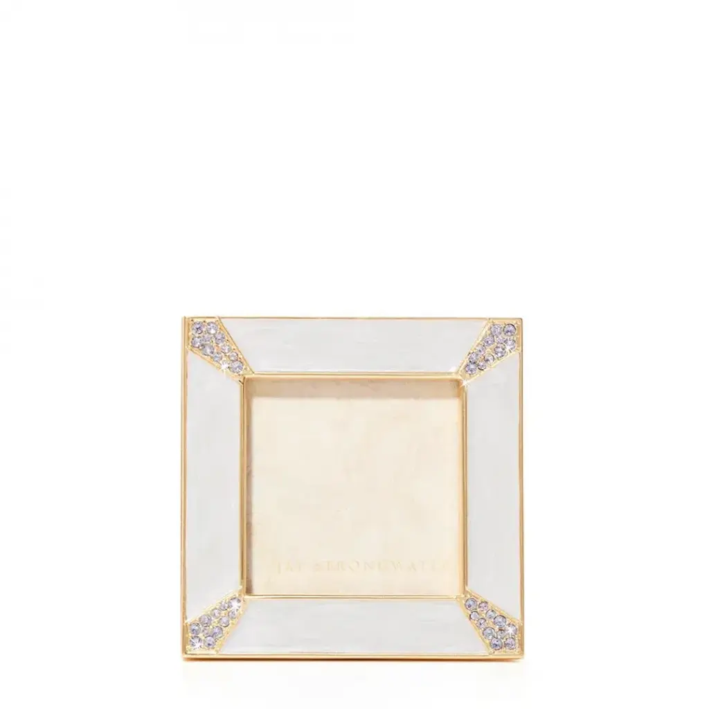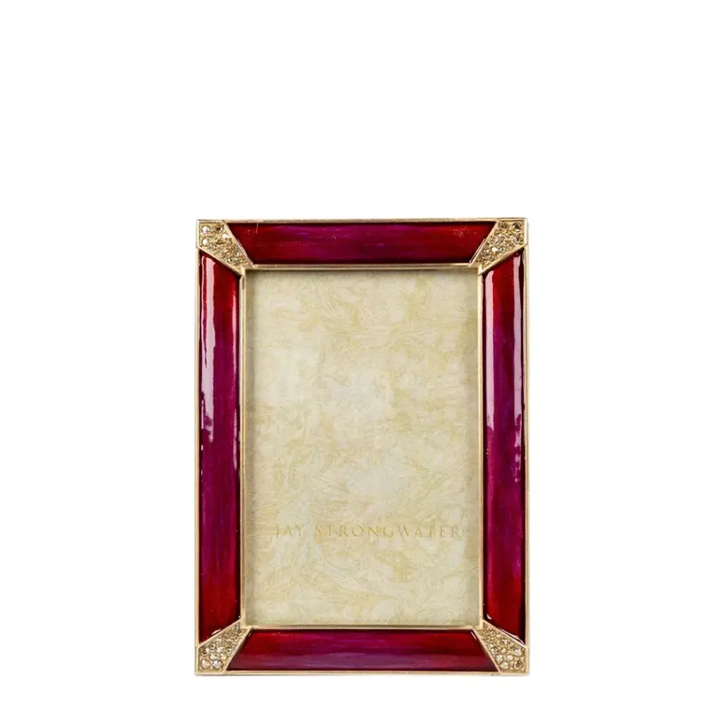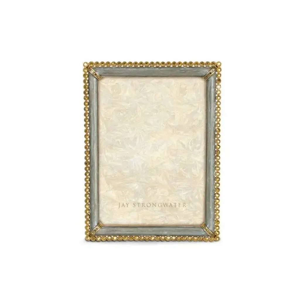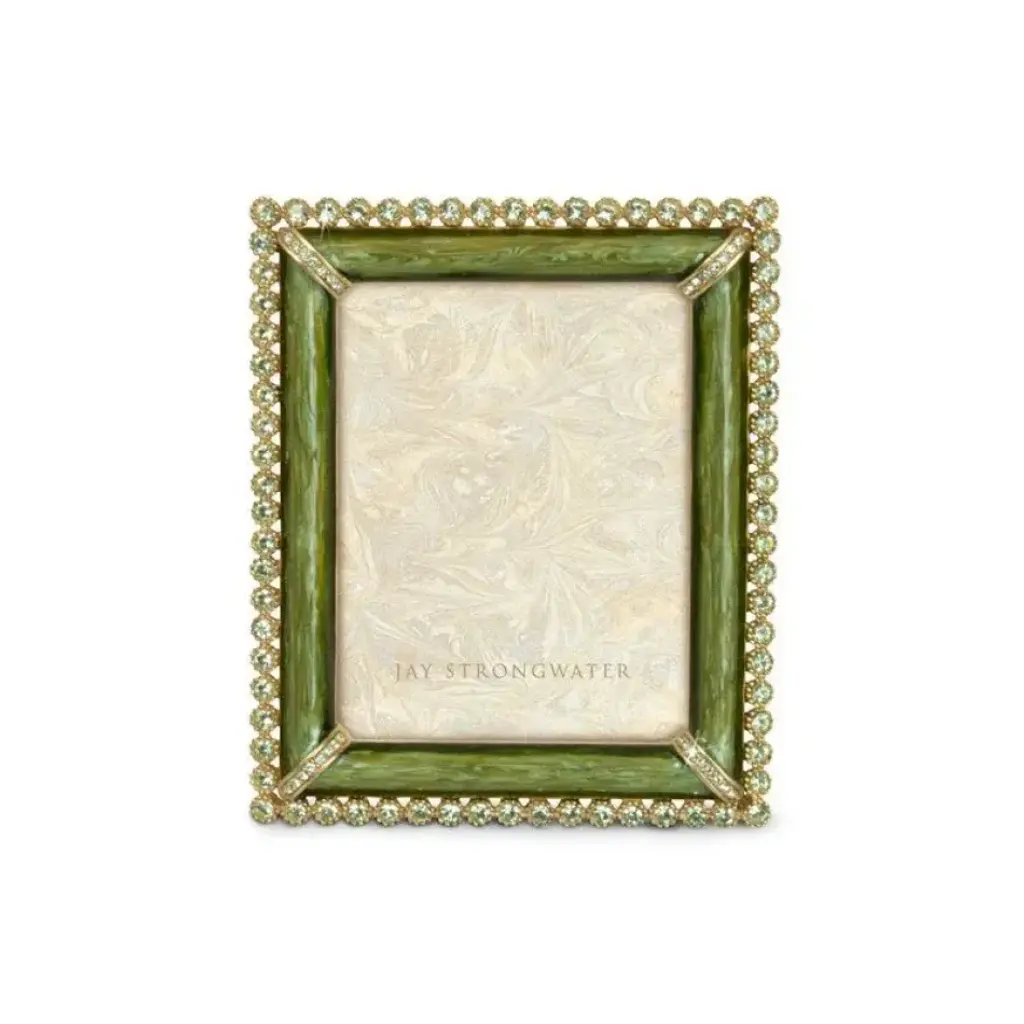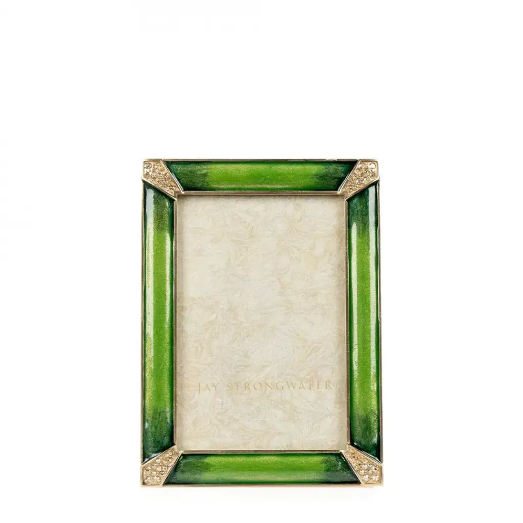 The Leland Frame exudes timeless elegance, enriching any cherished photograph it holds. Imbued with layers of rich, translucent green enamel, this handcrafted piece is cast in pewter and adorned with lustrous 14K gold plating. Each corner is lavishly embellished with pavé-set European crystals, adding a mesmerizing sparkle. The back plate, featuring our distinctive green enamel, complements the frame's beauty from every view, making it a captivating focal point in any setting.