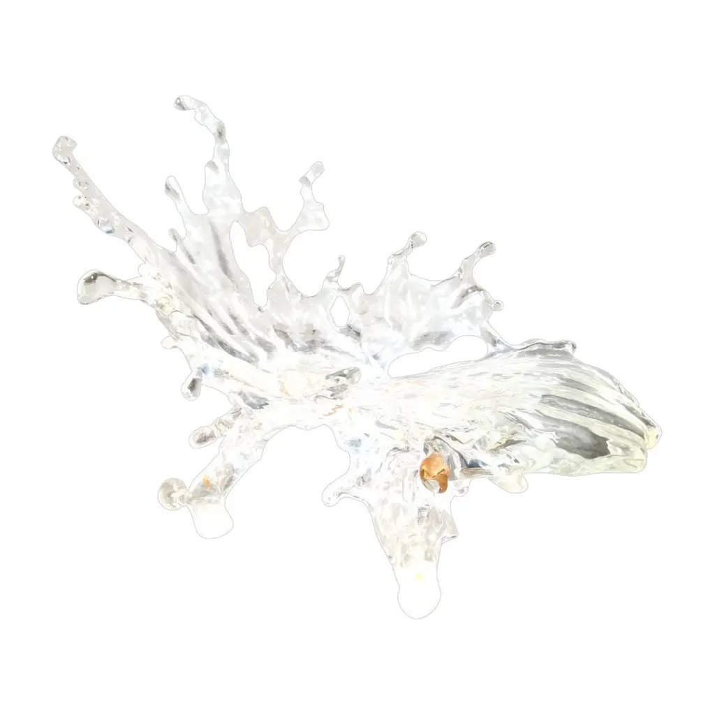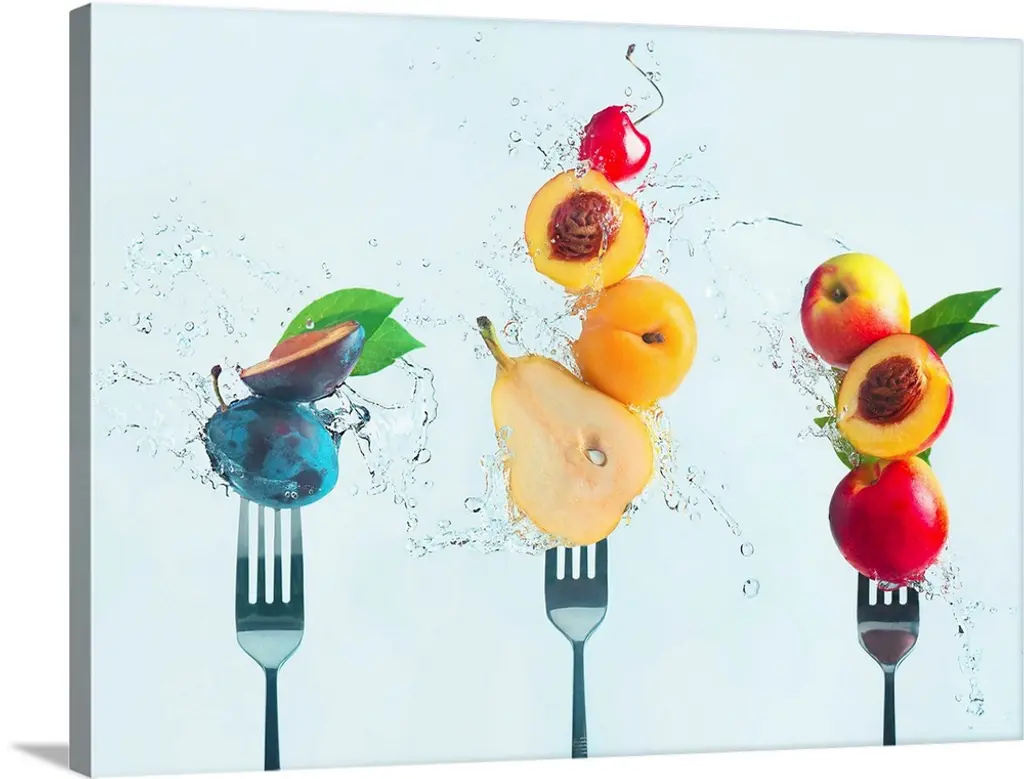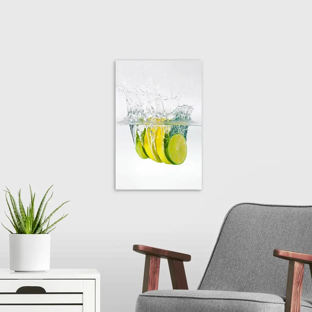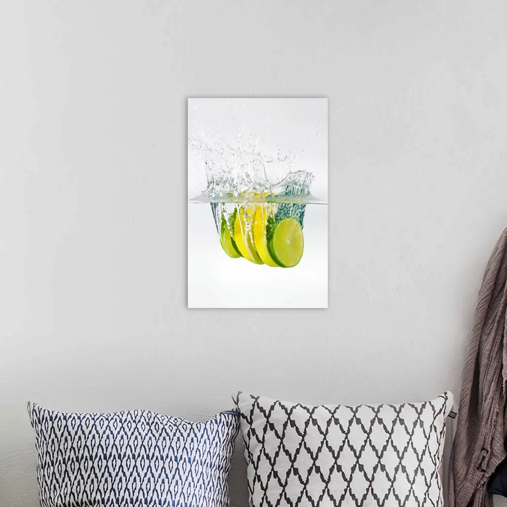 Huge photograph displays four slices of fruit as they splash into water.