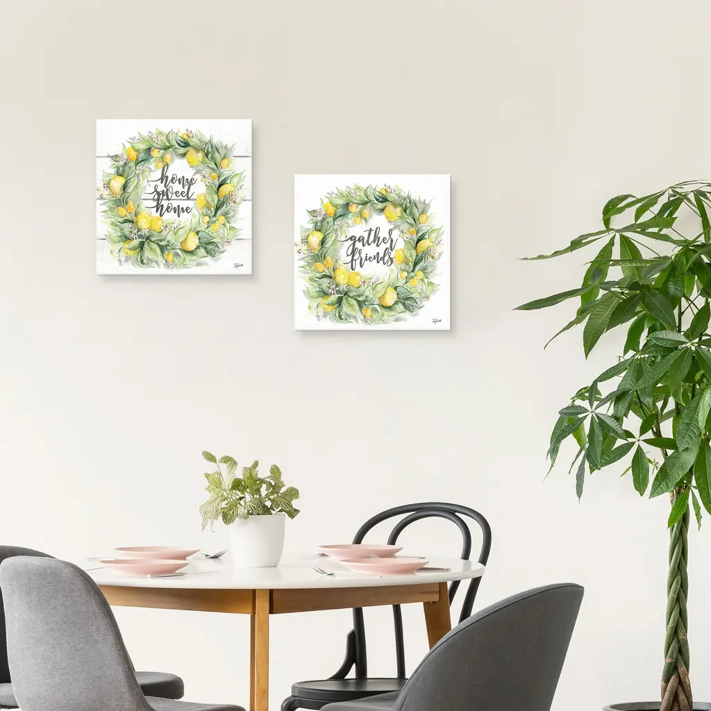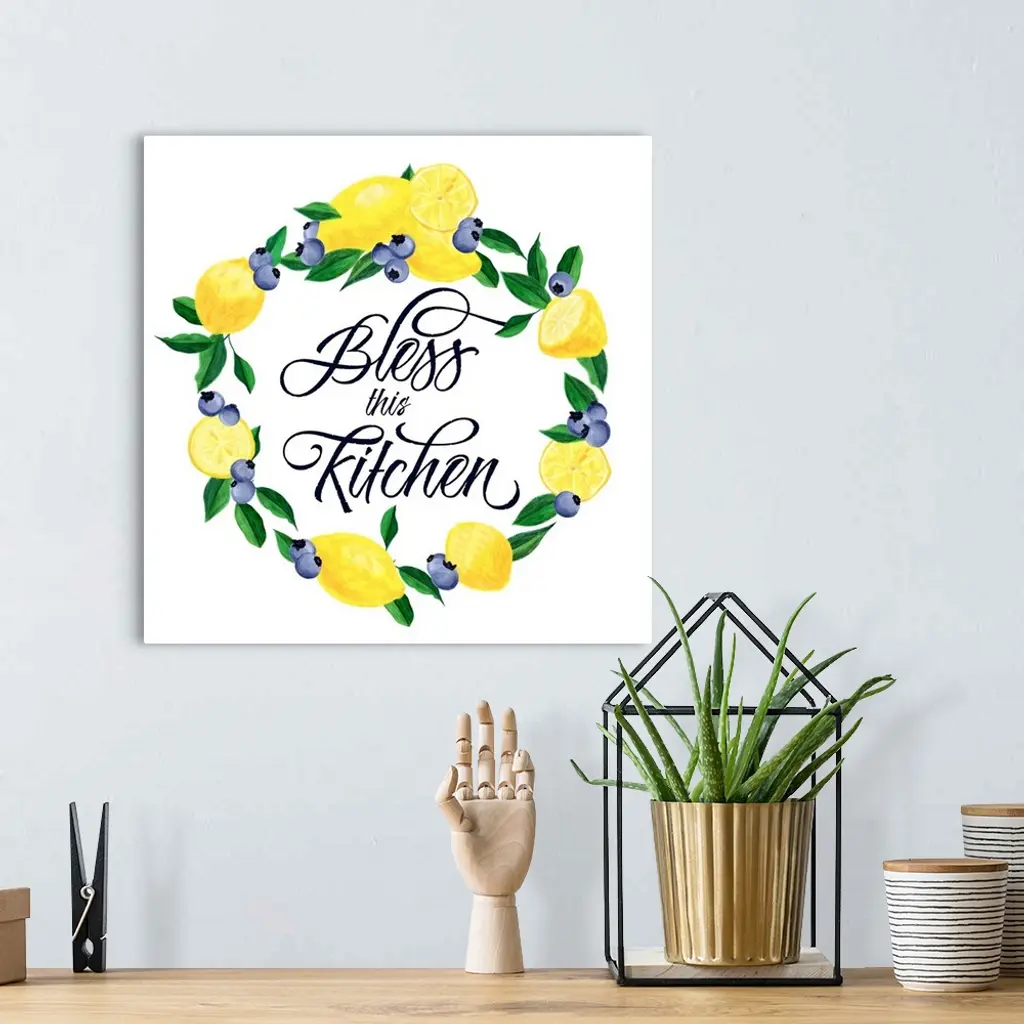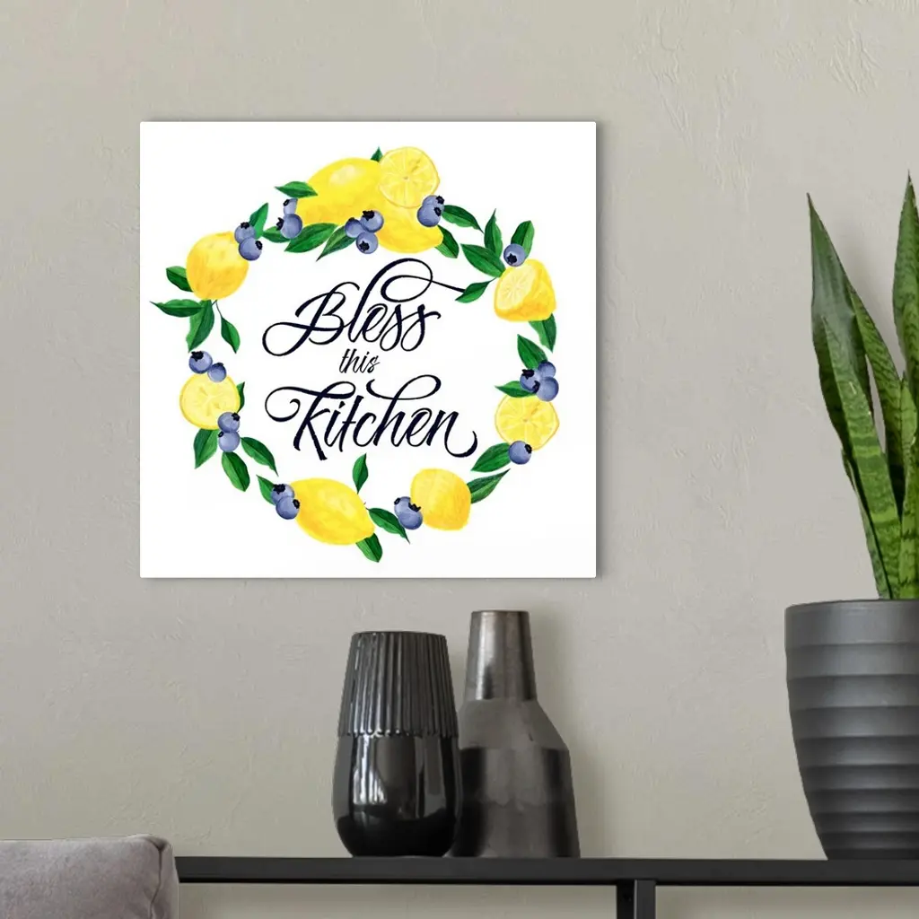 "Bless This Kitchen" in the middle of a wreath made of lemons and blueberries.