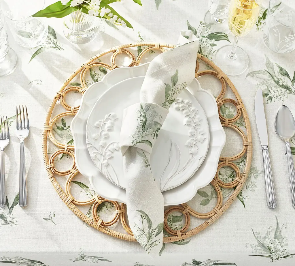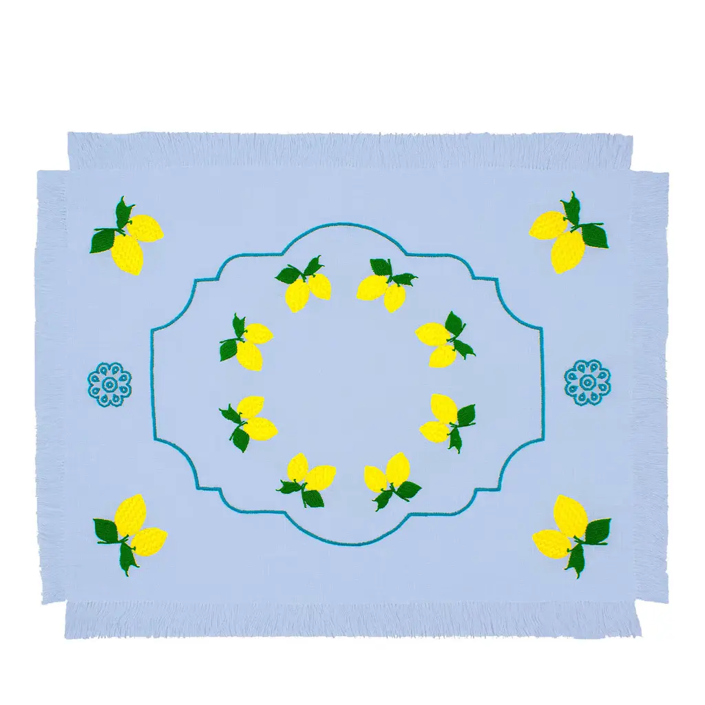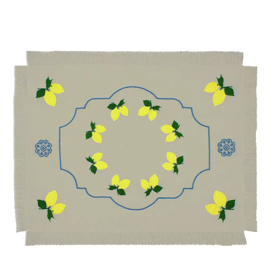 For a sunny yet sophisticated tone, lay out this gorgeously detailed table runner. Lightly striped linen-blend panels with open hemstitch detail pop with colorfully embroidered lemons.