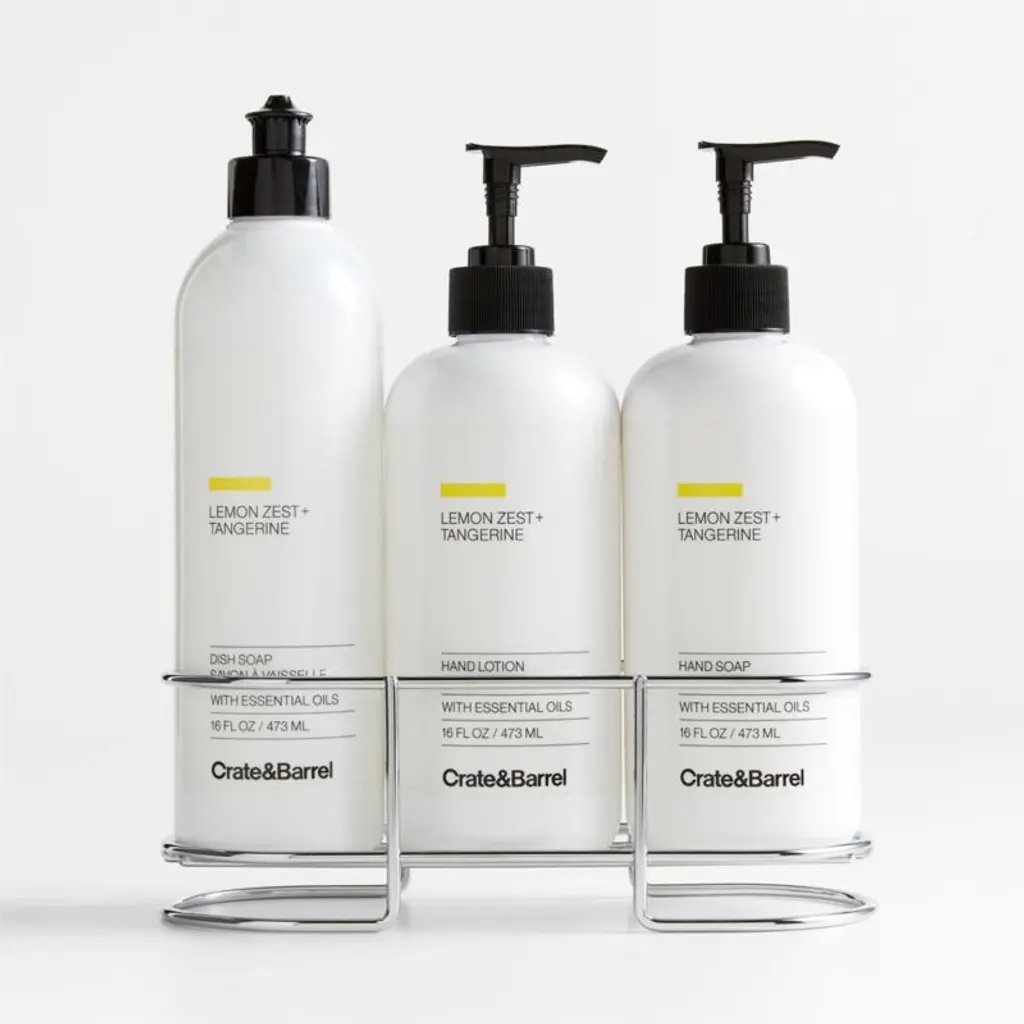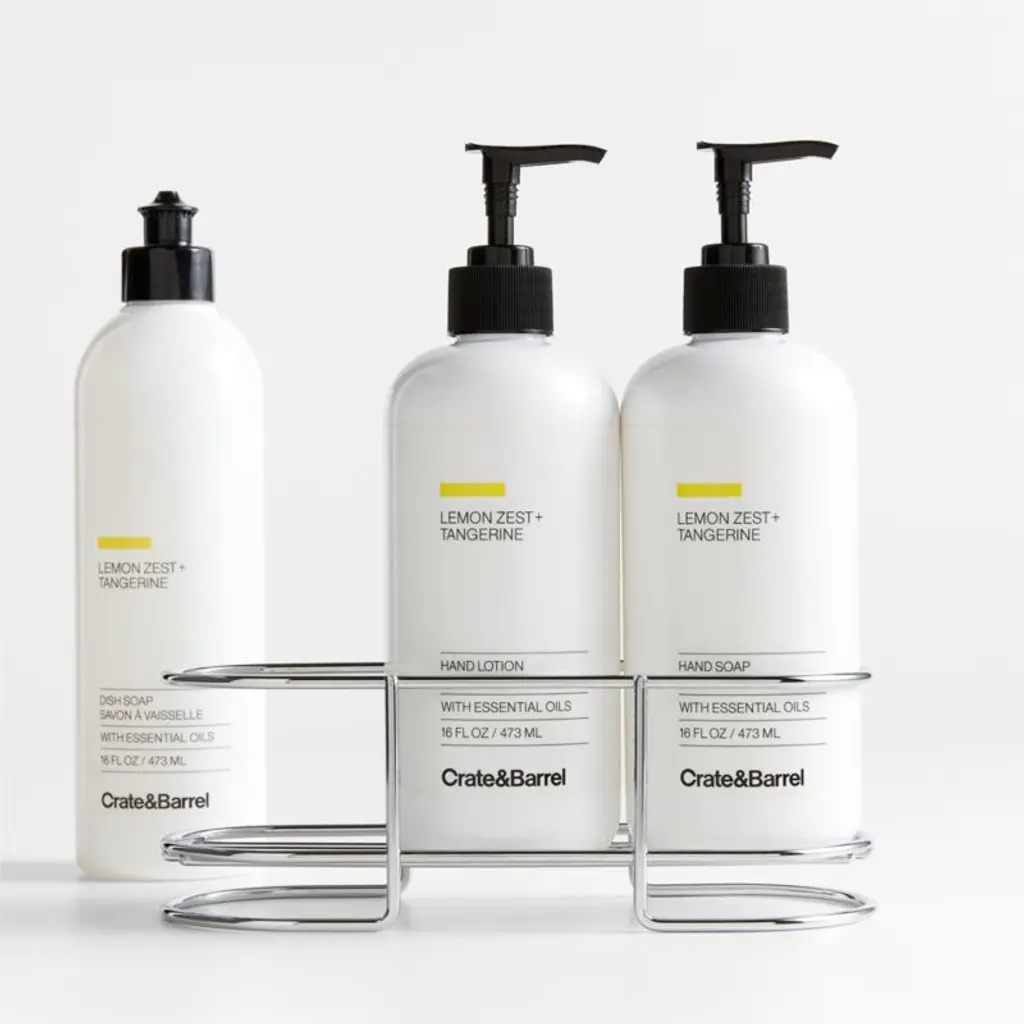Wash dishes and clean and soothe hands with the sweet, bright fragrances of lemon zest and tangerine featured in this exclusive four-piece set. Our dish soap tackles grease and residue with ease. Once the dishes are done, our hand soap moisturizes with sunflower seed oil and aloe vera as it cleans, while the hand lotion boasts mango seed oil and aloe. All three are made with plant-based formulas scented with essential oils that leave behind a fresh, clean aroma of lemongrass and geranium against a backdrop of zesty citrus. at hand while looking neat and stylish. Stainless steel curves the three-bottle caddy for a look that's neat and modern.View all "The Kitchen by Crate" collection