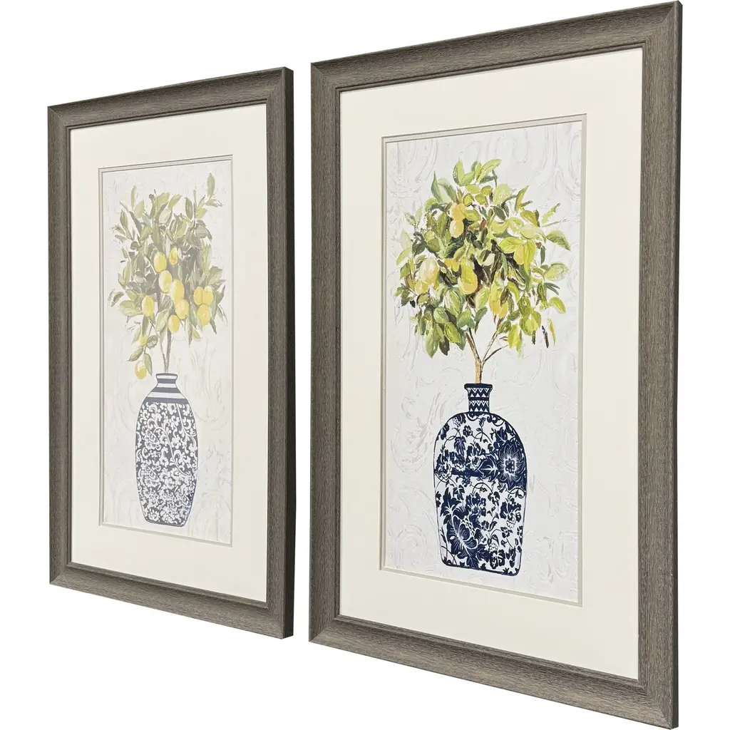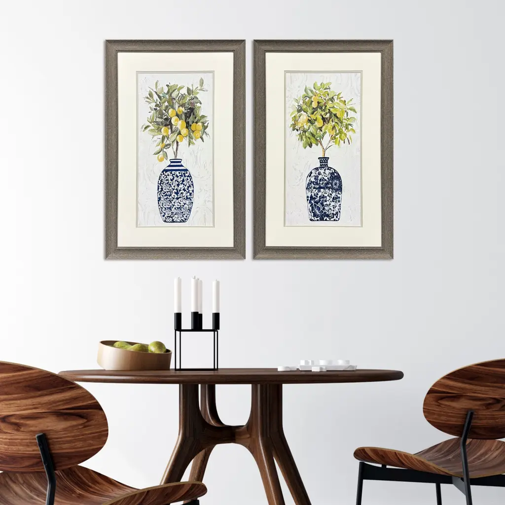Classic lemon tree topiary prints with blue vases are double matted with a white top mat. They are framed in a rustic wood-grain finish moulding.