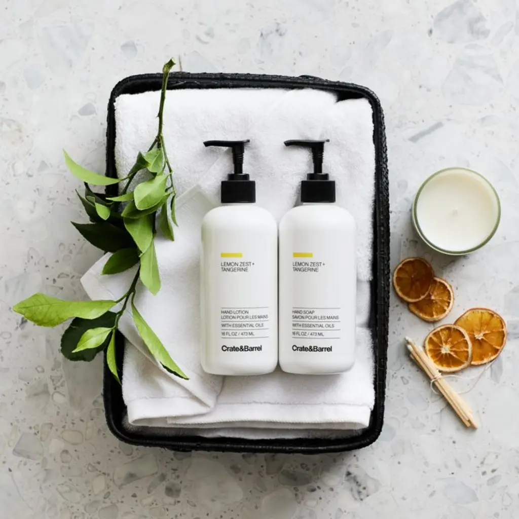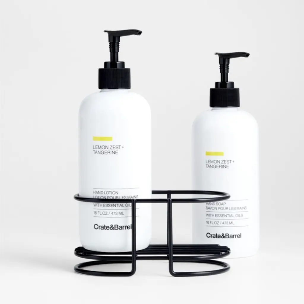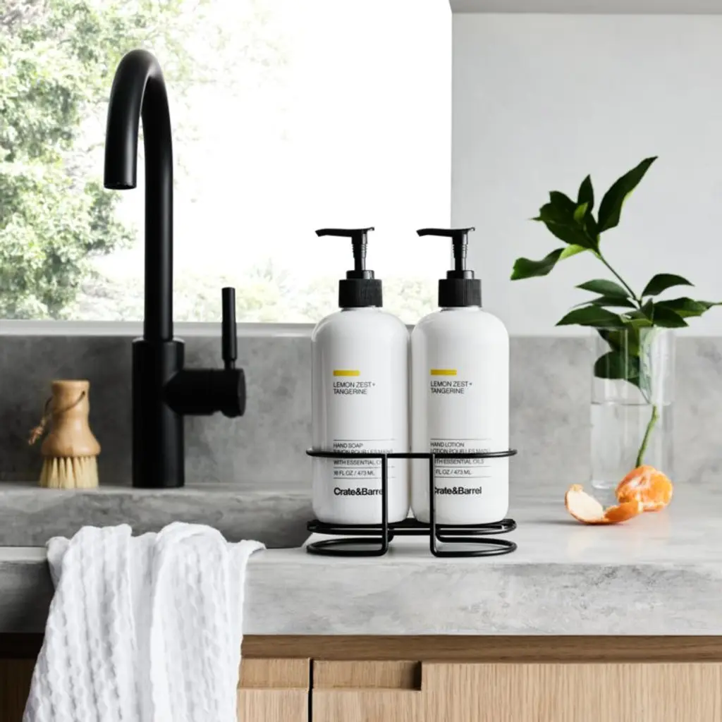 Clean and soothe hands with the sweet, bright fragrances of lemon zest and tangerine showcased in this three-piece set. Our gentle hand soap moisturizes with sunflower seed oil and aloe vera as it cleans, while the hand lotion boasts mango seed oil and aloe. Both leave behind a fresh, clean aroma of lemongrass and geranium against a backdrop of zesty citrus. Echoing the enticing smells of baking and cooking, our exclusive kitchen scent collection features plant-based formulas with deliciously fragrant combinations of essential oils. The matte black caddy keeps the bottles corralled right where they're needed, and our signature black-and-white design looks crisp and modern next to the sink.View all "The Kitchen by Crate" collection