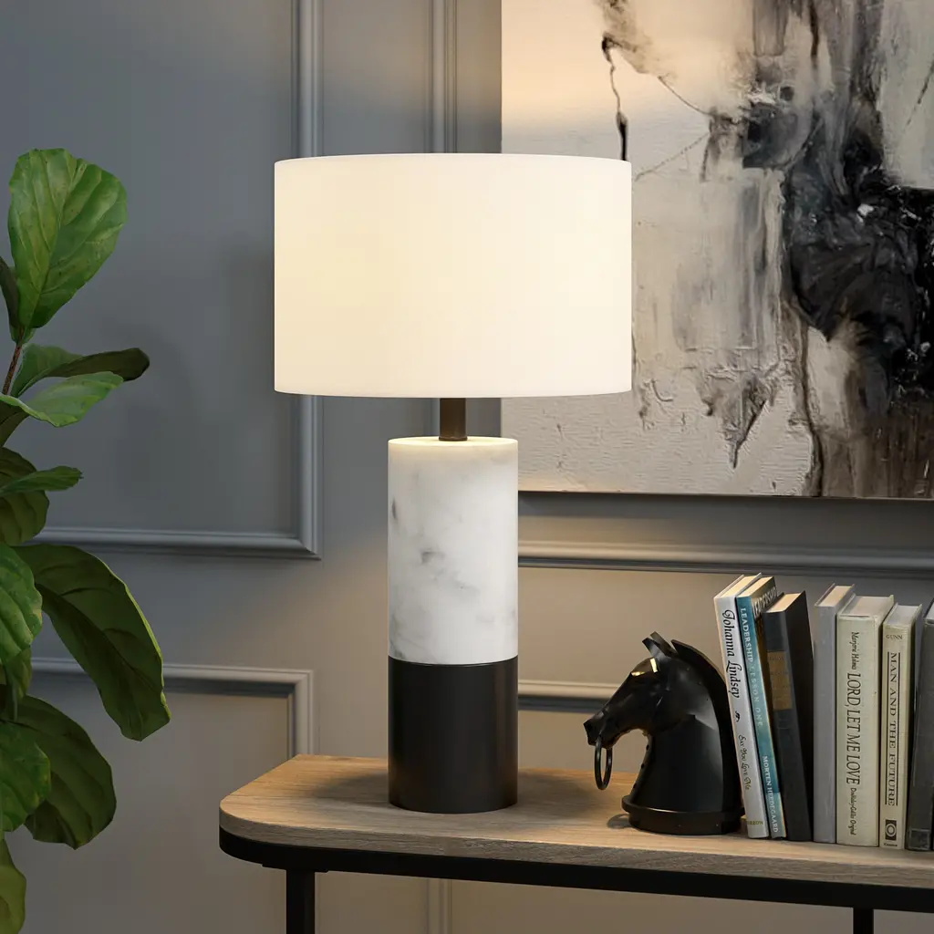 Evoke classical Italian décor with a glam modern edge with this striking table lamp. The colorblocked pedestal base is an eye-catching combination of natural and manmade materials, featuring real Arabescato marble and a handcrafted metal accent. Topped with a crisp drum shade, this weighty fixture creates a stylish statement piece anywhere you use it.