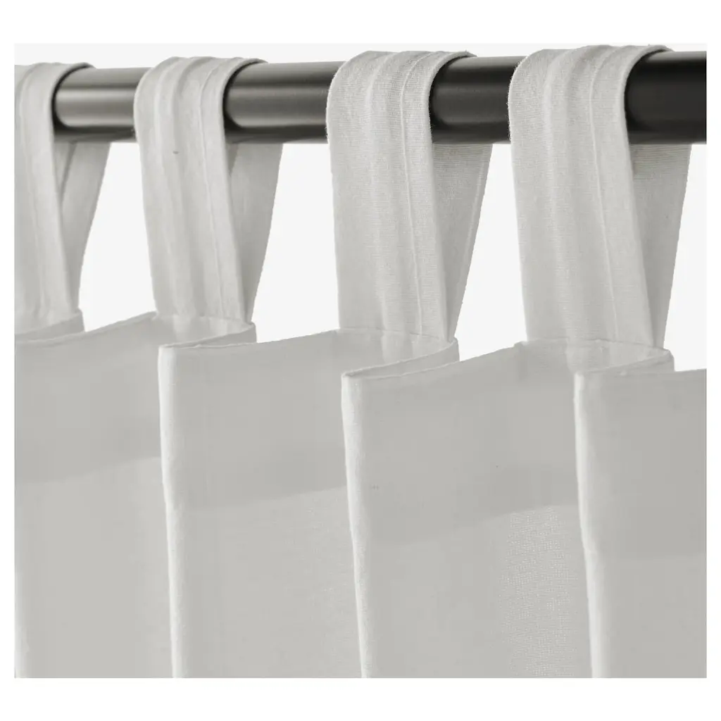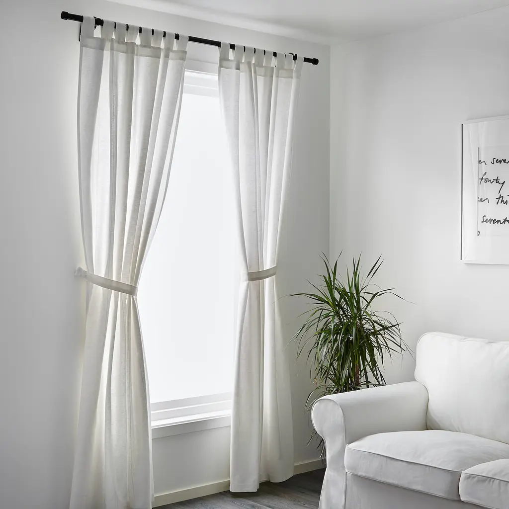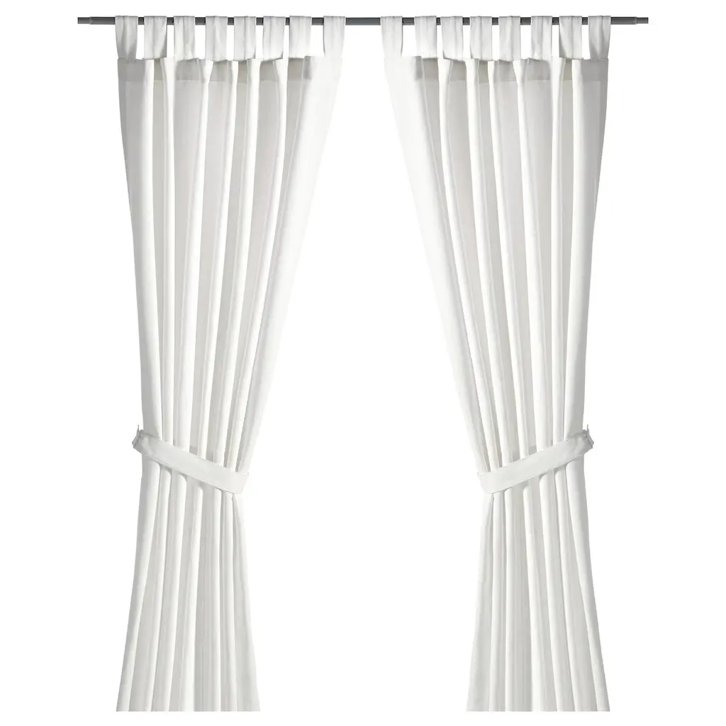 LENDA Curtains with tie-backs, 1 pair - white 55x98 ". The tab heading allows you to hang the curtains directly on a curtain rod. The curtain lowers the general light level and provides privacy by preventing people outside from seeing directly into the room. Contains 2 panels with tie-backs.