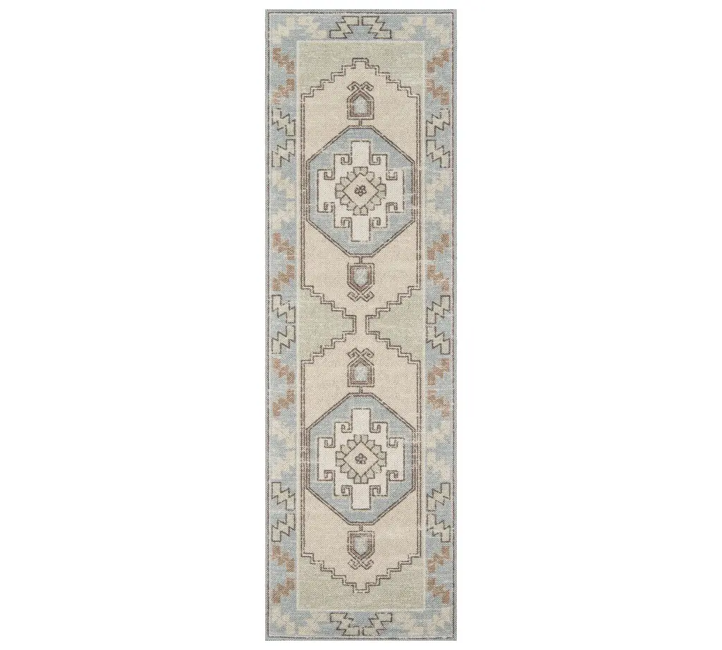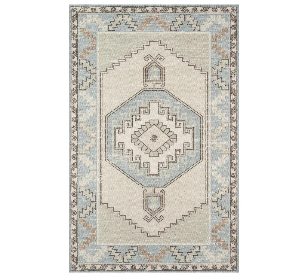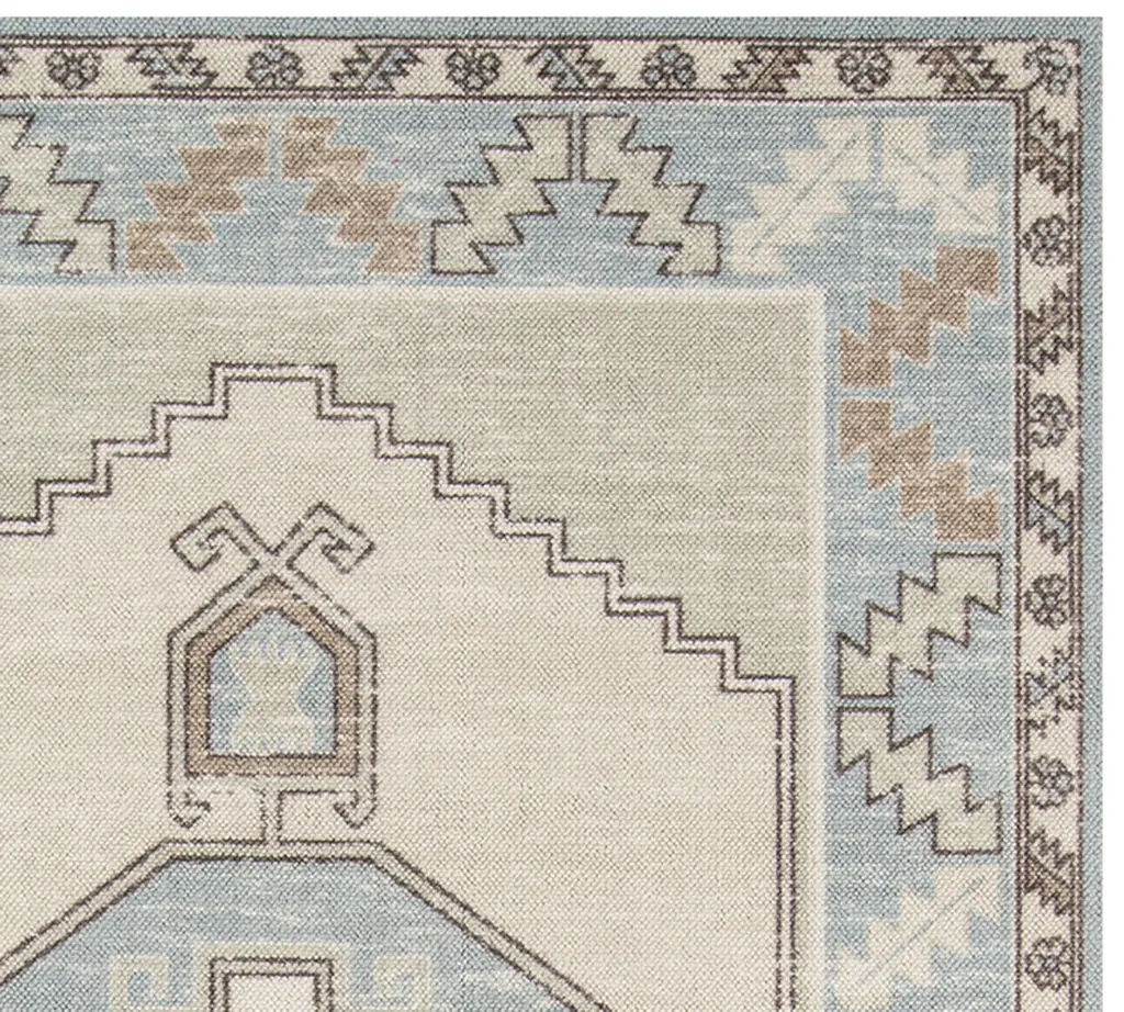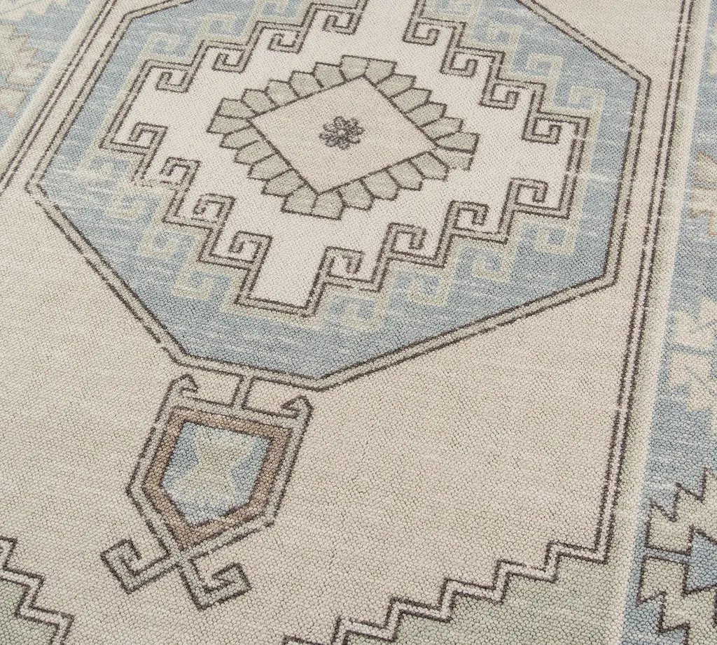 A softer take on beloved Persian-style designs, the Lenora Rug boasts subdued shades of baby blue, sage green and tonal neutrals. A medallion takes center stage, bordered by geometric renderings and floral motifs. Soft and durable, the innovative cross-weaving of natural wool and nylon threads creates an accent rug that’s made for any room.