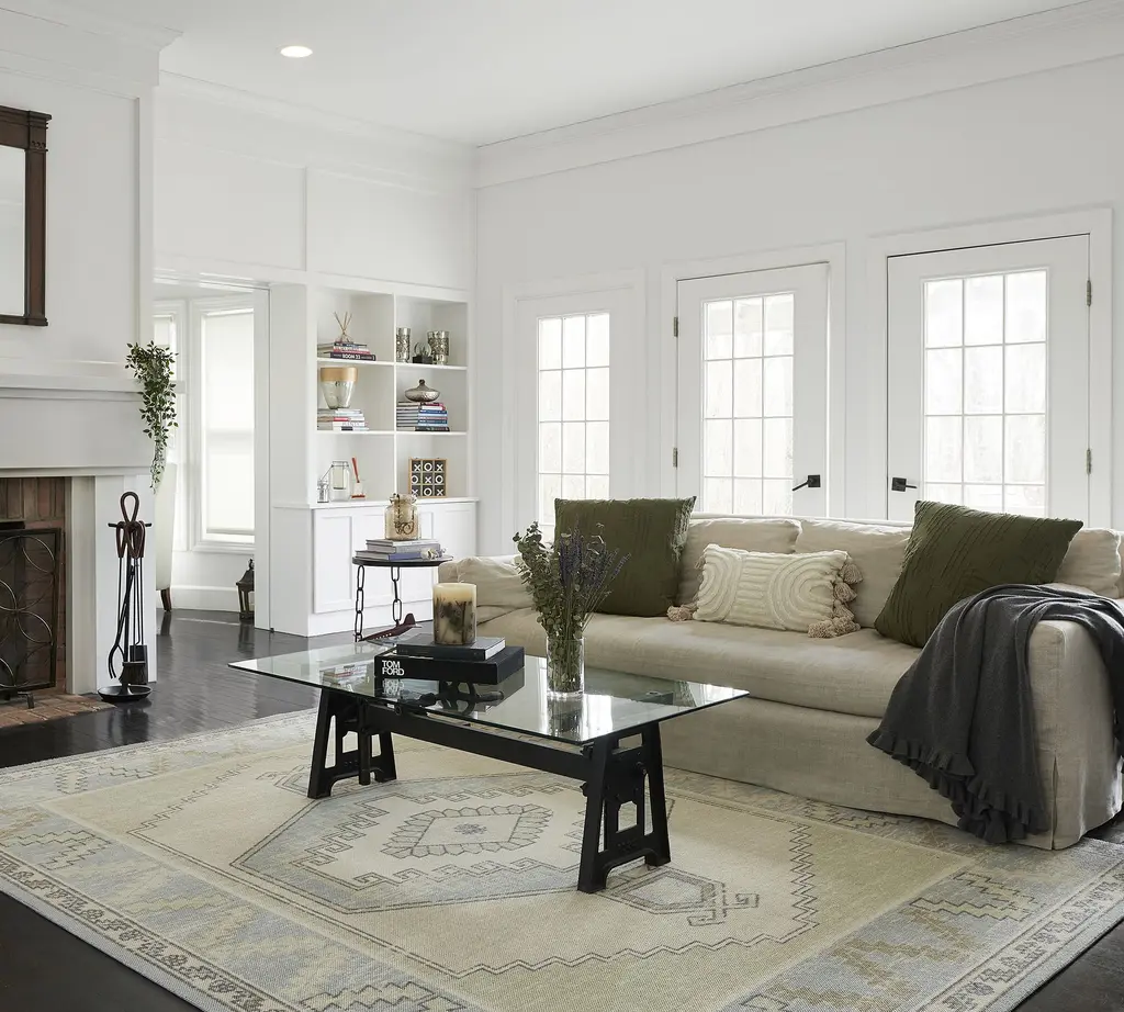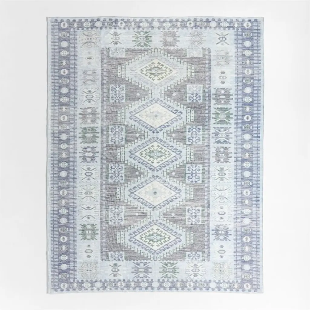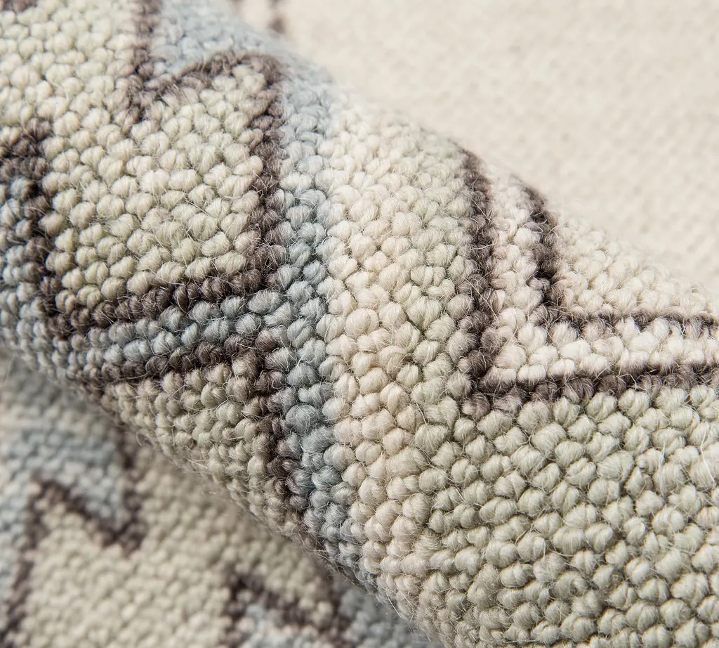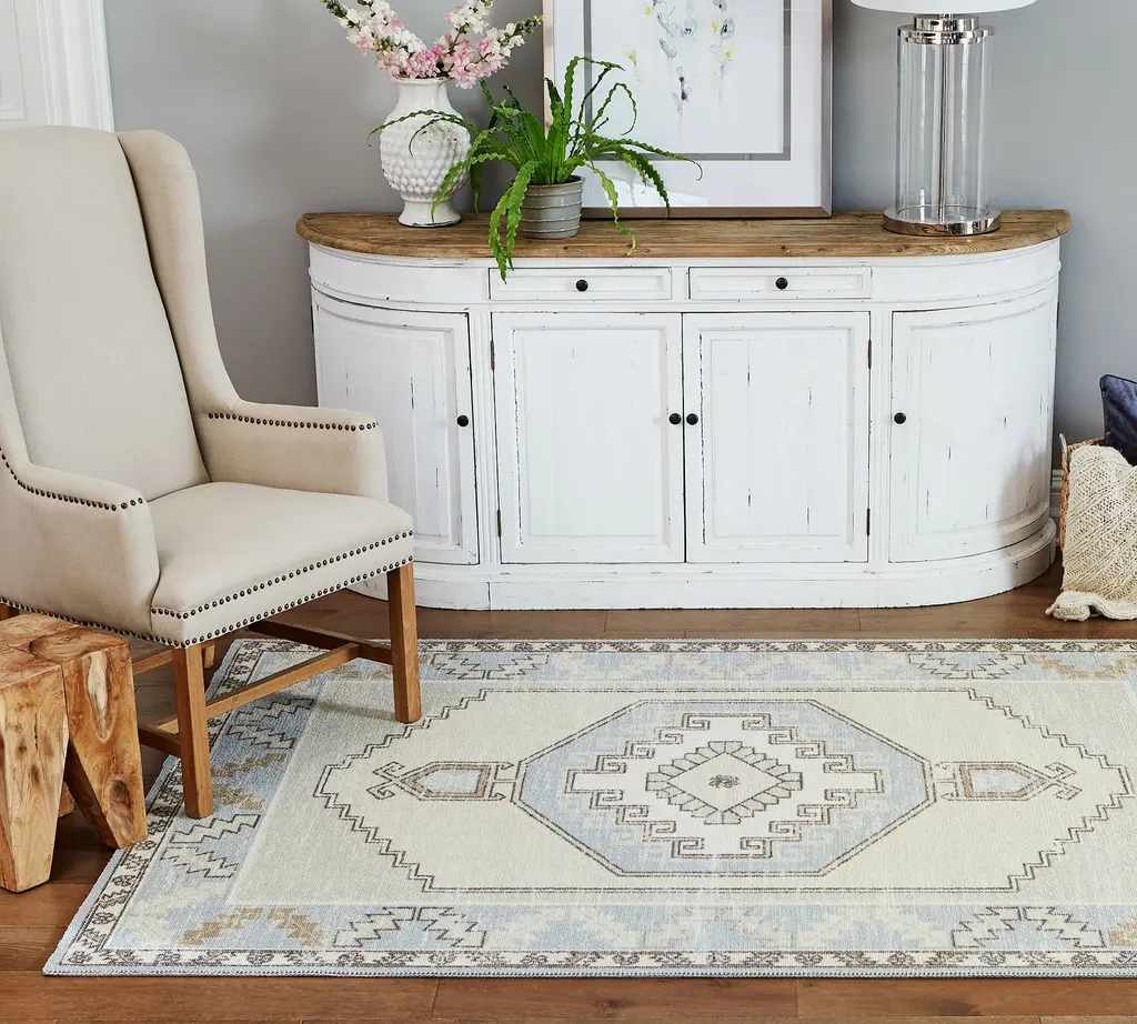 A softer take on beloved Persian-style designs, the Lenora Rug boasts subdued shades of baby blue, sage green and tonal neutrals. A medallion takes center stage, bordered by geometric renderings and floral motifs. Soft and durable, the innovative cross-weaving of natural wool and nylon threads creates an accent rug that’s made for any room.