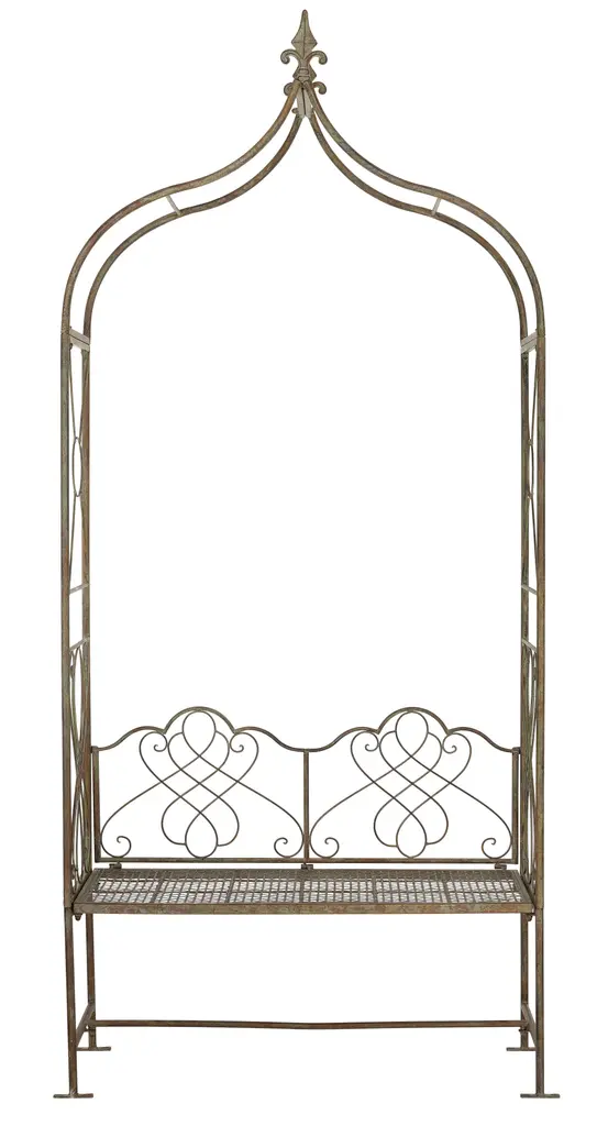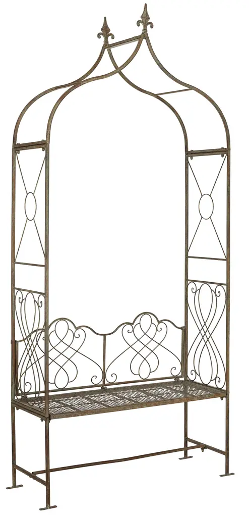 What could be more romantic than a loveseat nestled under a flowering outdoor arbor? Artfully crafted of rustic blue iron, this piece boasts classic English style, and proves the perfect training ground for evening vines or climbing roses. Store outdoor furniture indoors or cover well when not in use. Remove wooden furniture from standing water. Dust regularly with small brush or vacuum. Spills should be taken care of immediately before they harden or stain with a slightly dampened sponge. Do not use bleach solutions. Some assembly required.