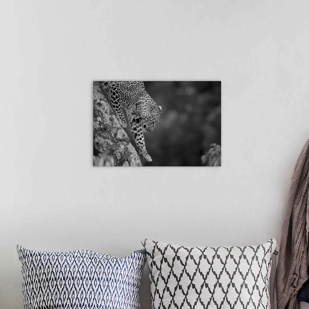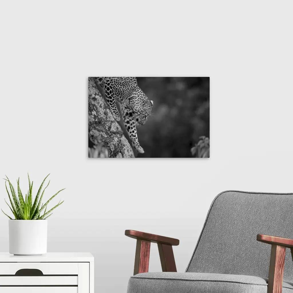 Close-up of a leopard (panthera pardus) lifting its paw walking down a branch at the Kicheche bush camp, Masai mara, Kenya.