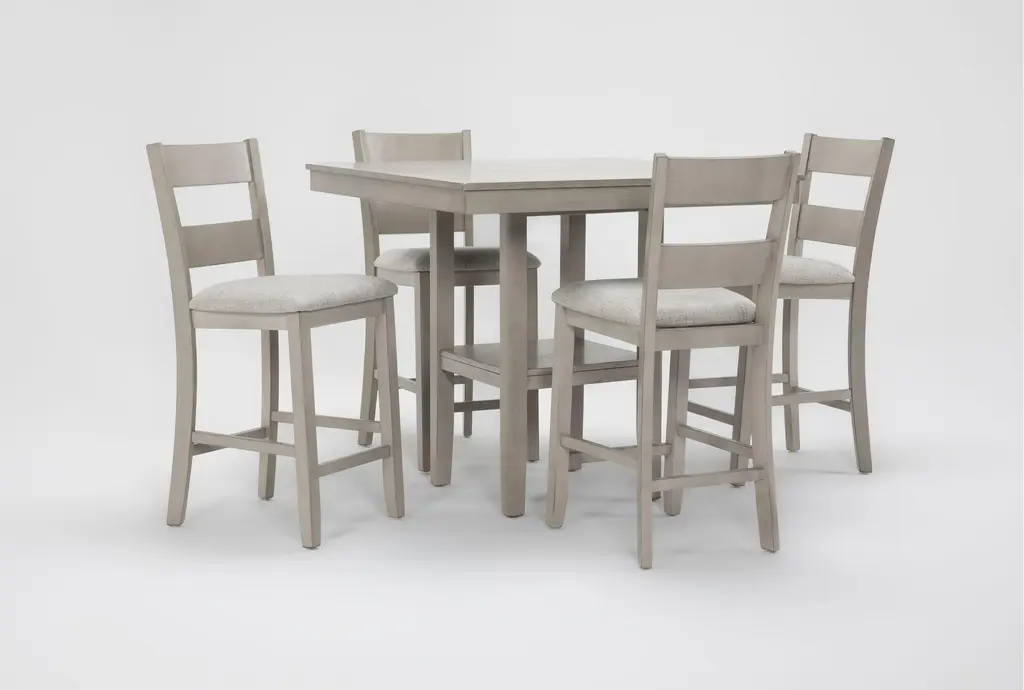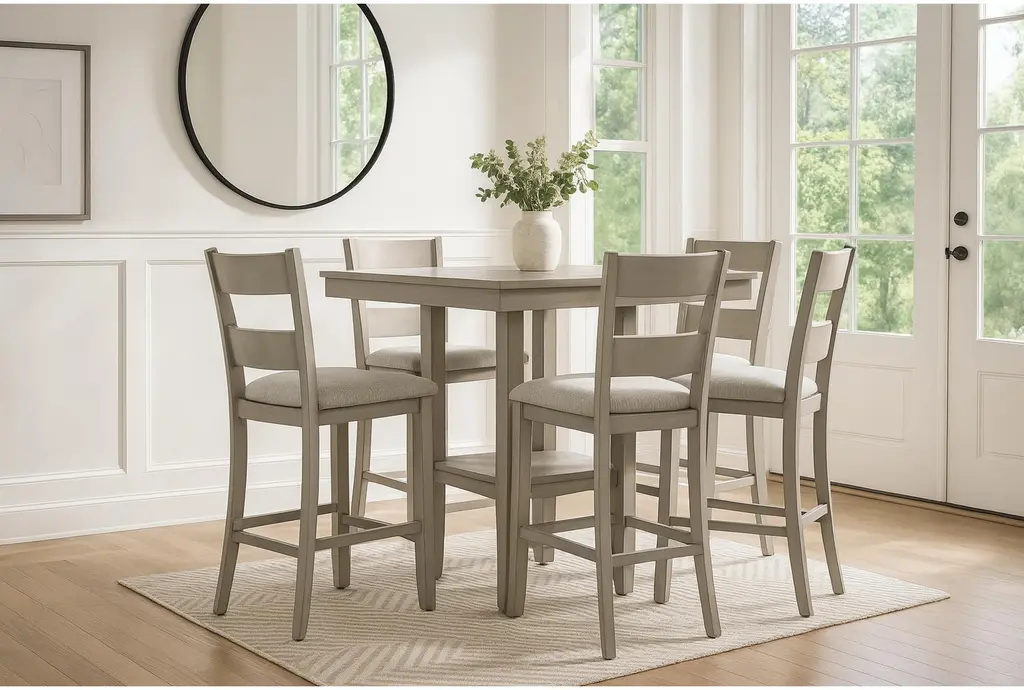 Elevate your dining experience with the Lerra Driftwood White Square Wood 40" Pedestal Counter Height Table Set for 4. This traditional set, finished in an antique white, brings a timeless and classic charm to your kitchen or dining area. Crafted from MDF with hickory wood veneer, rubberwood, acacia, and bentwood fabric, it offers both durability and style.