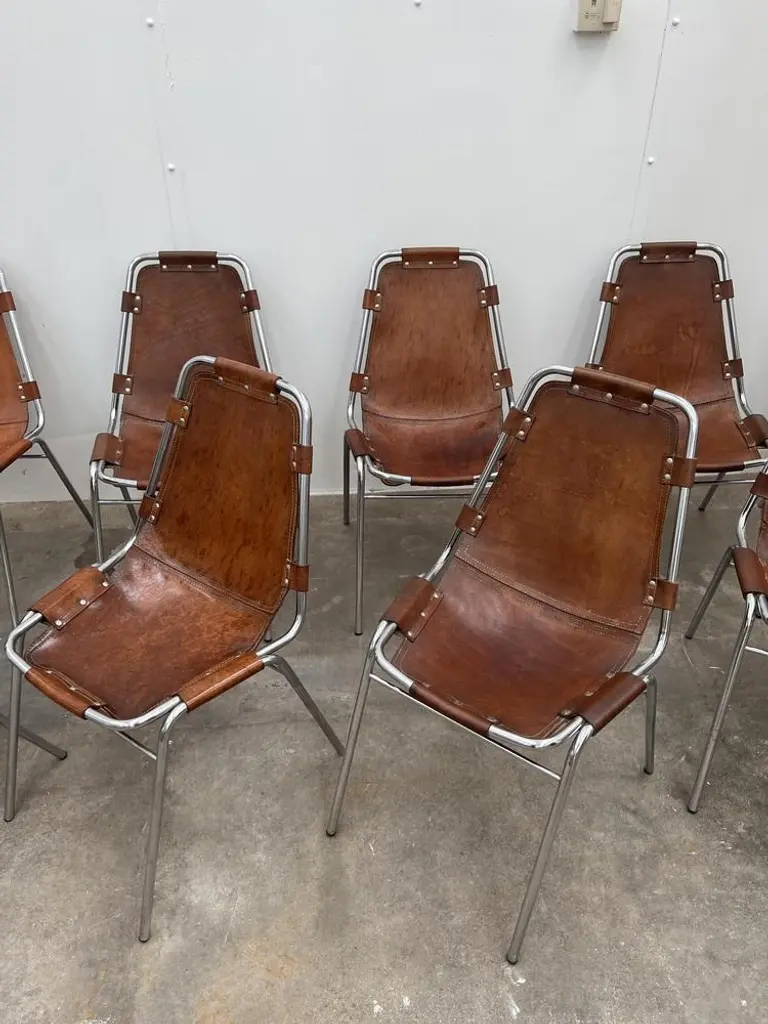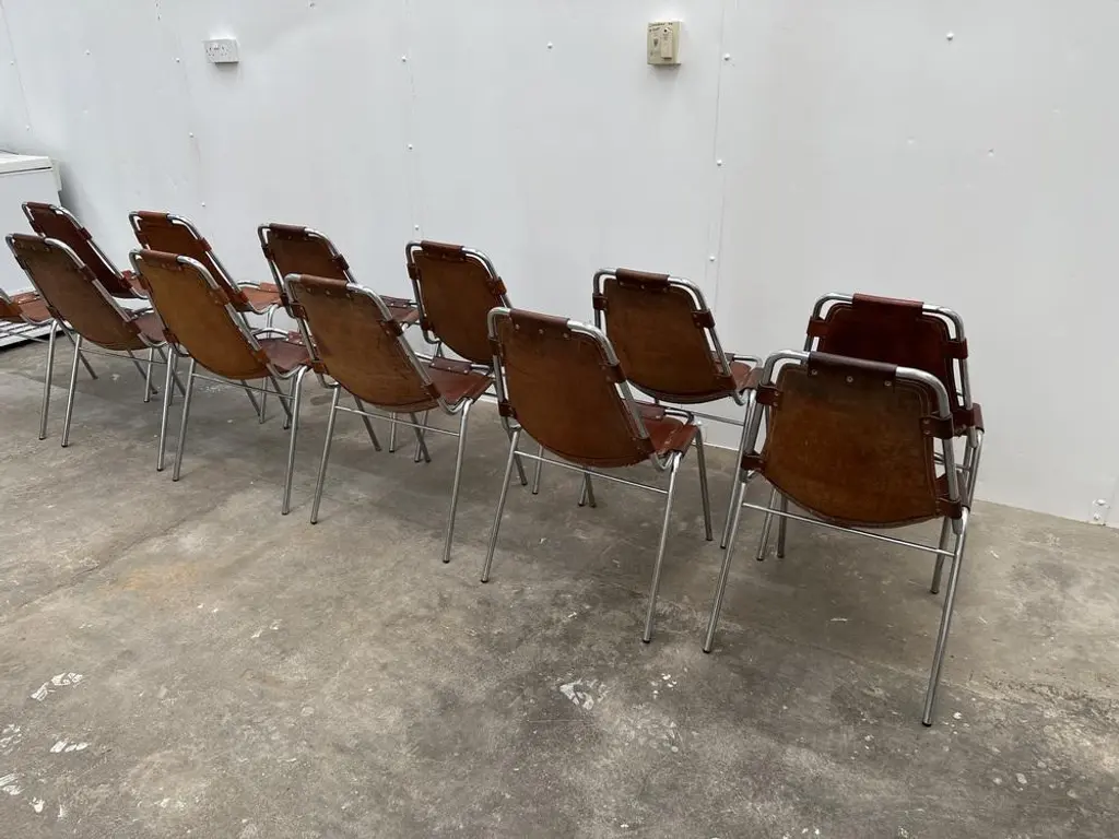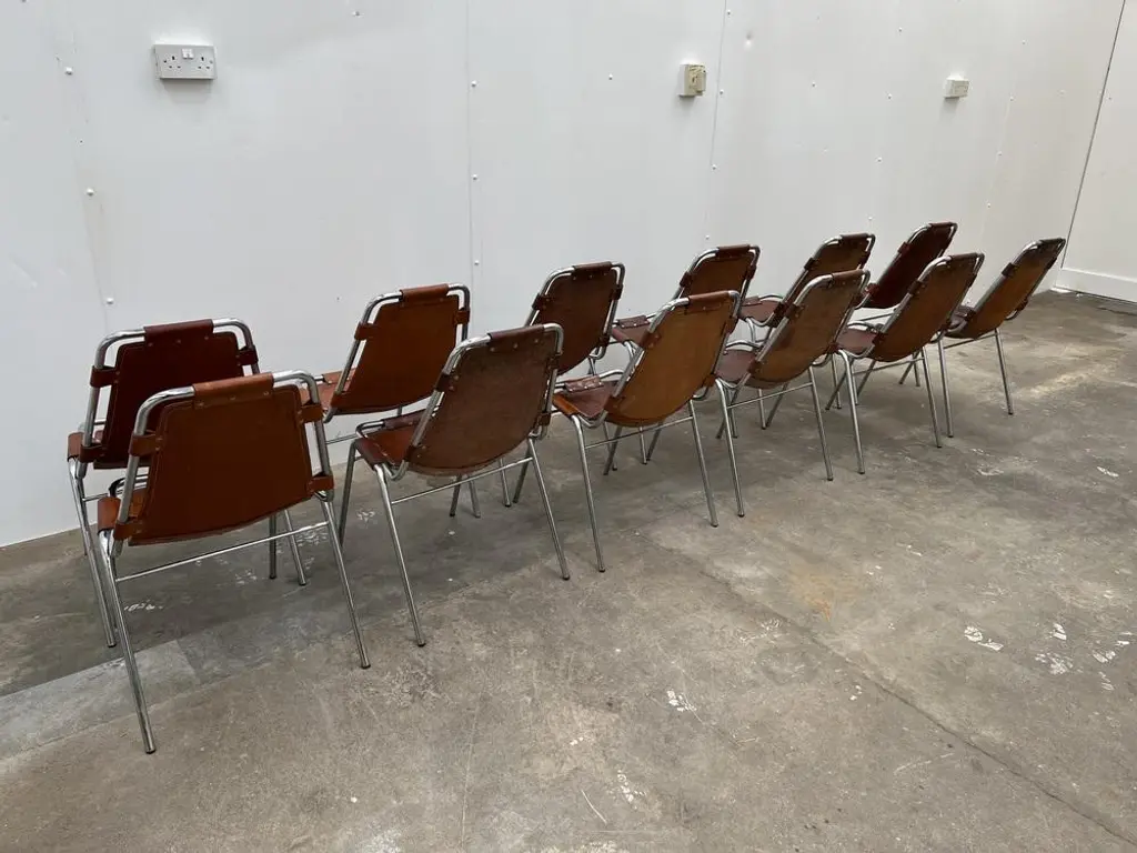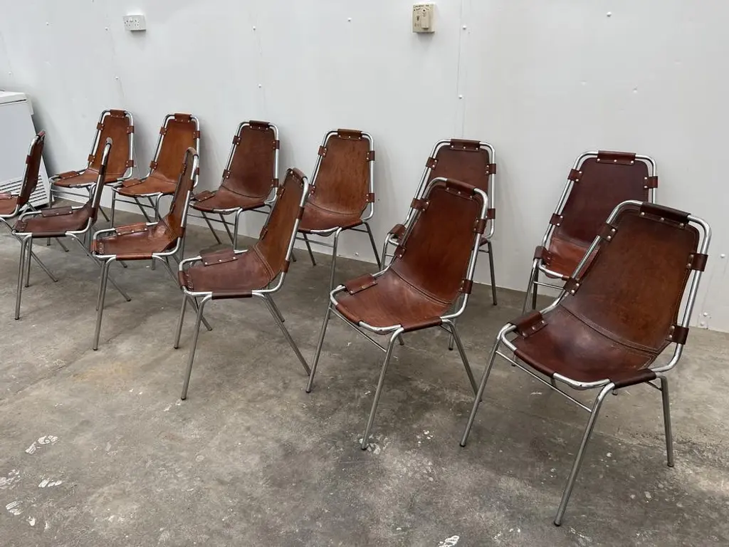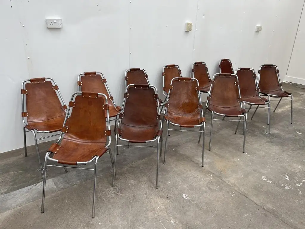 Stunning set of chairs, you will not find another set of 12 chairs like this one on any web site worldwide! Selected by Charlotte Perriand for Les Arcs Ski Resort, circa 1960. Very nice chrome tubular frame with thick brown leather seats. These chairs have been chosen by us on their lovely matching patina out of a total of 40 chairs, we have selected on patina and quality to make sure that the chairs in this set match up as good as we possibly could achieve! In other words a very special set. Very nice chrome tubular frame with thick brown leather seats, Leather has a lovely natural patina. The frames have some patina and marks, these chairs are all original Perriand chairs. We have two sets available Measure: Height 82 cm, seat height 44 cm, depth 60 cm, width 48 cm. I have official proof of authenticity such as vintage catalogs, designer records, or other literature sources and take full responsibility for any authenticity issues arising from misattribution