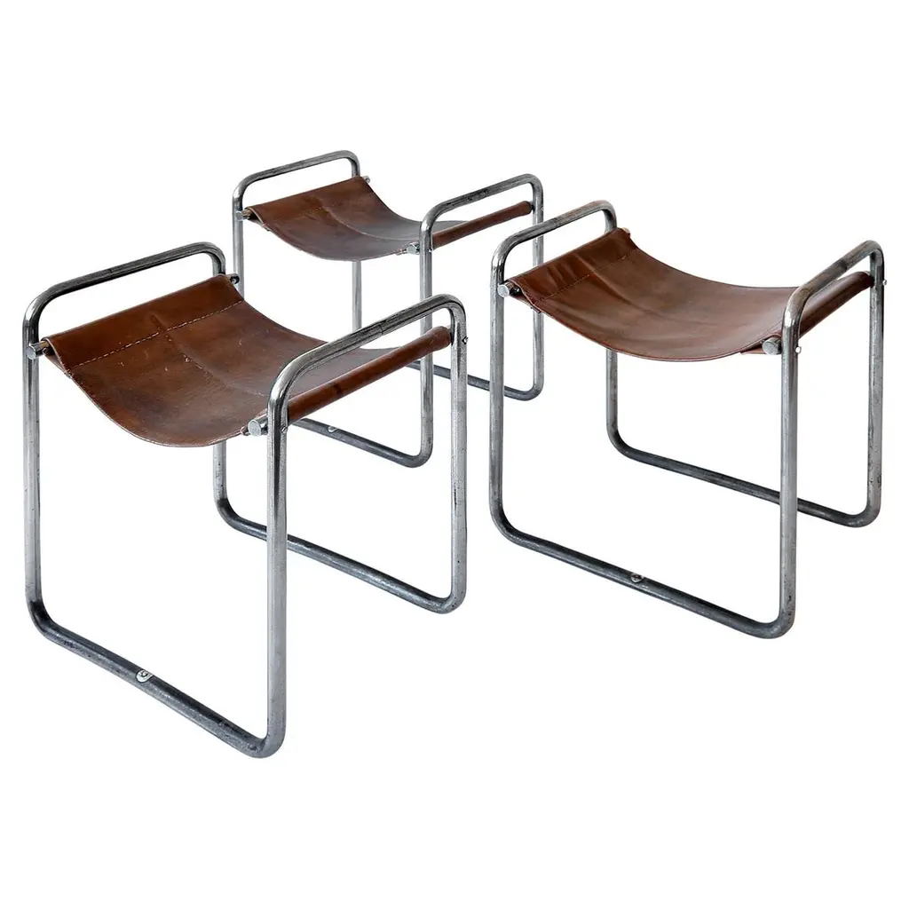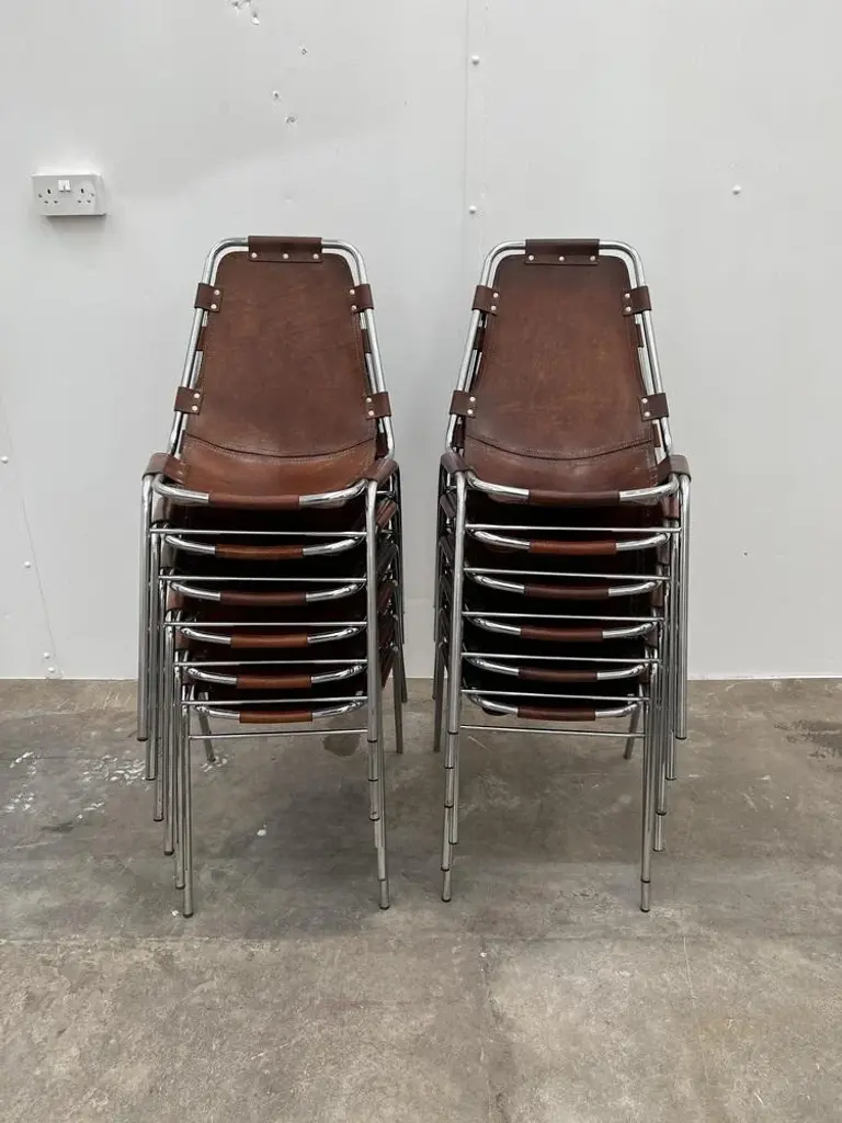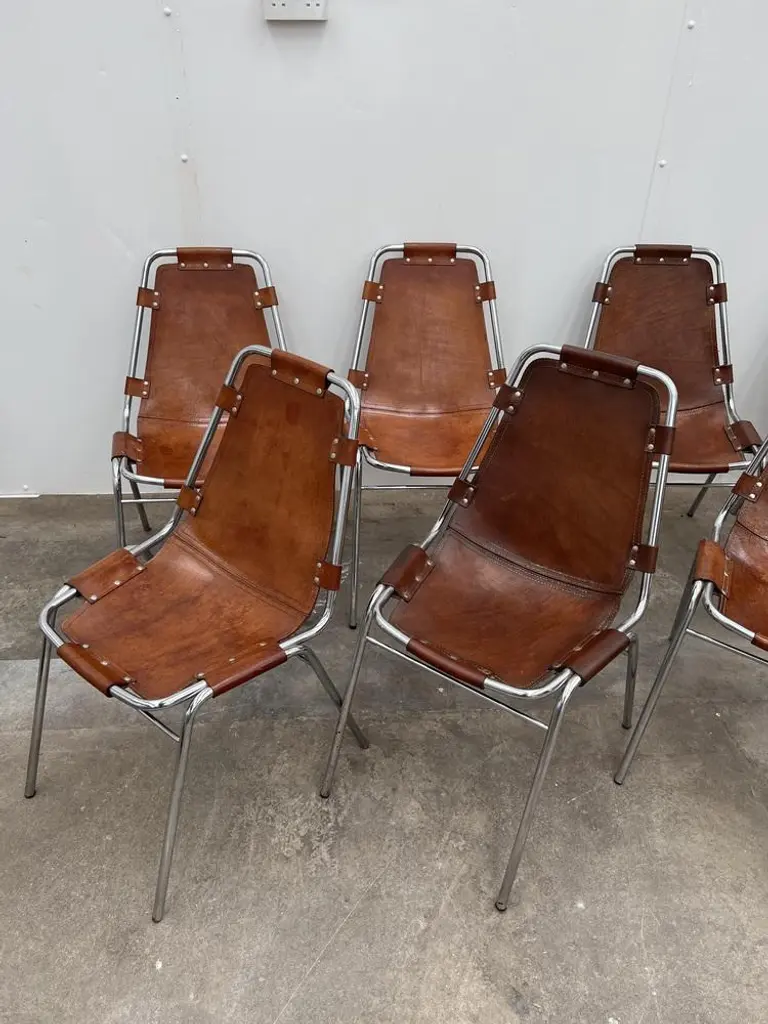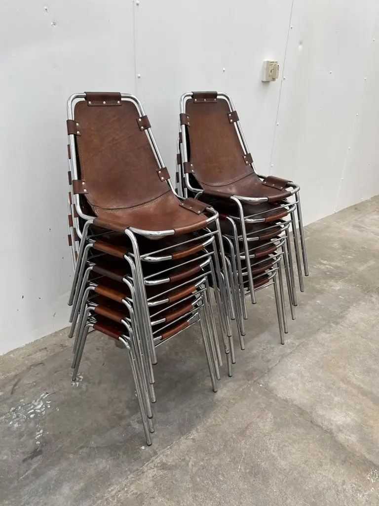 Stunning set of chairs, you will not find another set of 12 chairs like this one on any web site worldwide! Selected by Charlotte Perriand for Les Arcs Ski Resort, circa 1960. Very nice chrome tubular frame with thick brown leather seats. These chairs have been chosen by us on their lovely matching patina out of a total of 40 chairs, we have selected on patina and quality to make sure that the chairs in this set match up as good as we possibly could achieve! In other words a very special set. Very nice chrome tubular frame with thick brown leather seats, Leather has a lovely natural patina. The frames have some patina and marks, these chairs are all original Perriand chairs. We have two sets available Measure: Height 82 cm, seat height 44 cm, depth 60 cm, width 48 cm. I have official proof of authenticity such as vintage catalogs, designer records, or other literature sources and take full responsibility for any authenticity issues arising from misattribution