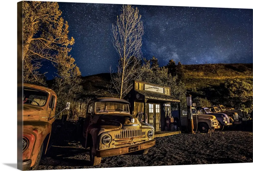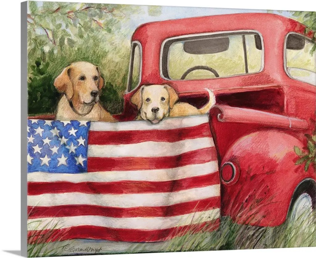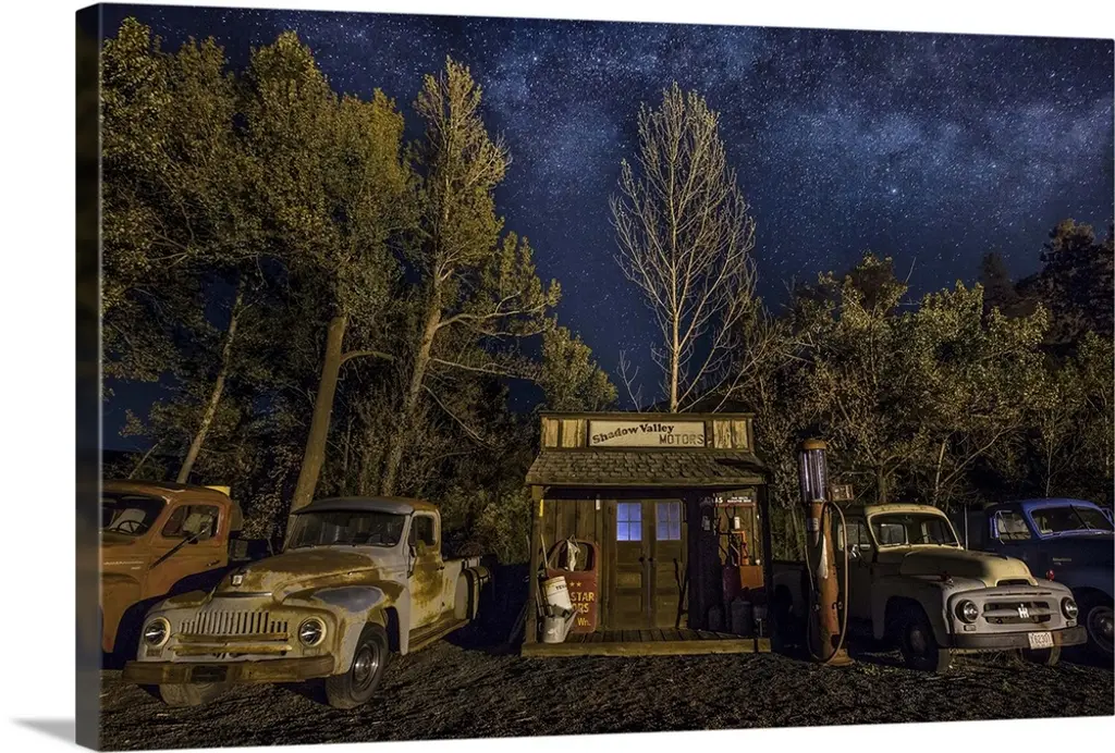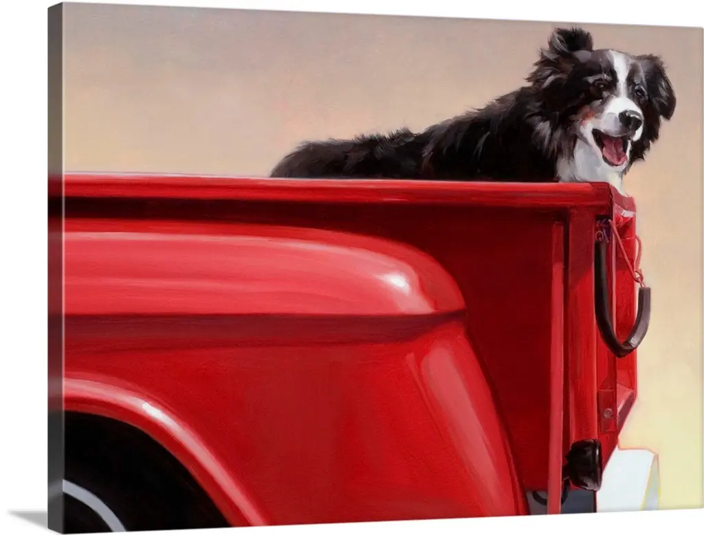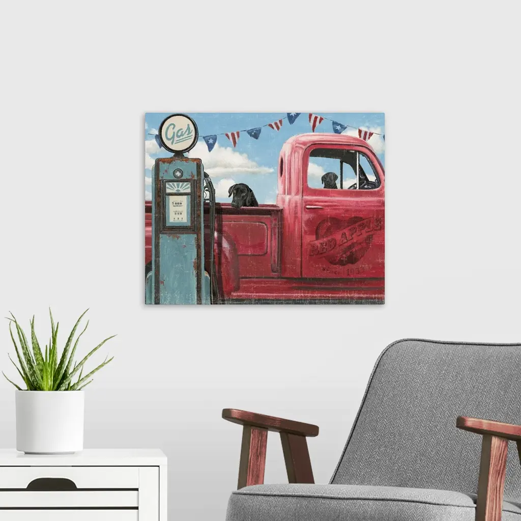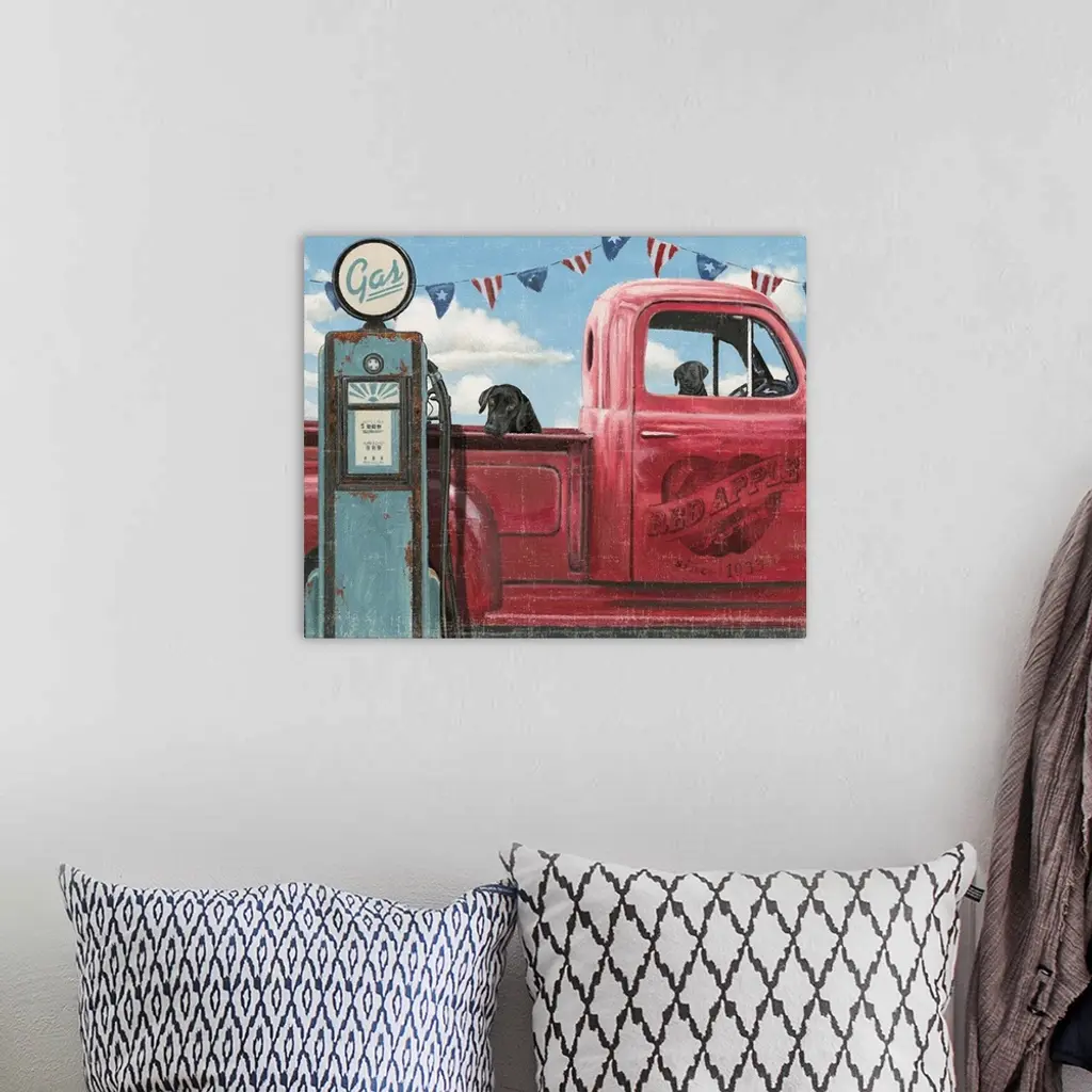 Two dogs sitting in a vintage red truck at a gas station with a weathered, aged effect overlay.
