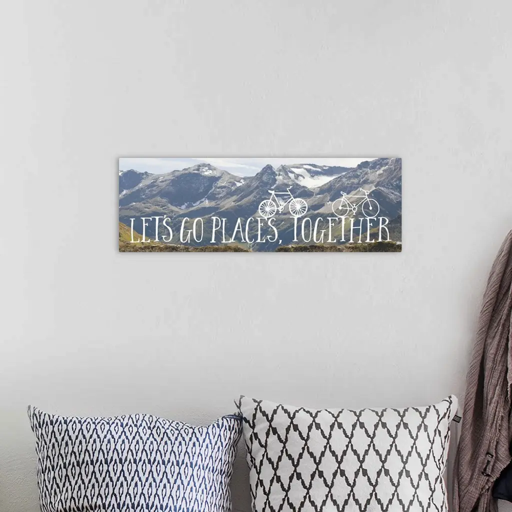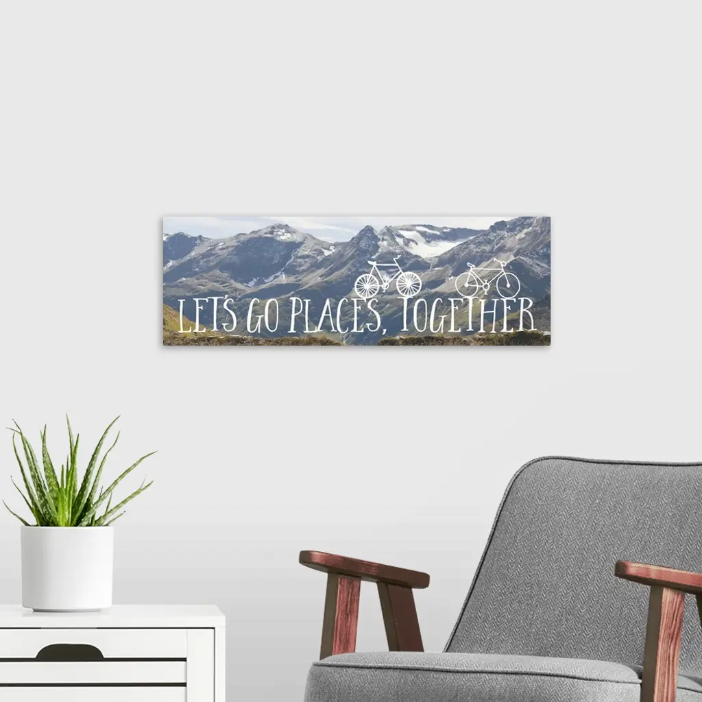 Handwritten sentiment with two small bicycles over an image of a snowy mountain range.