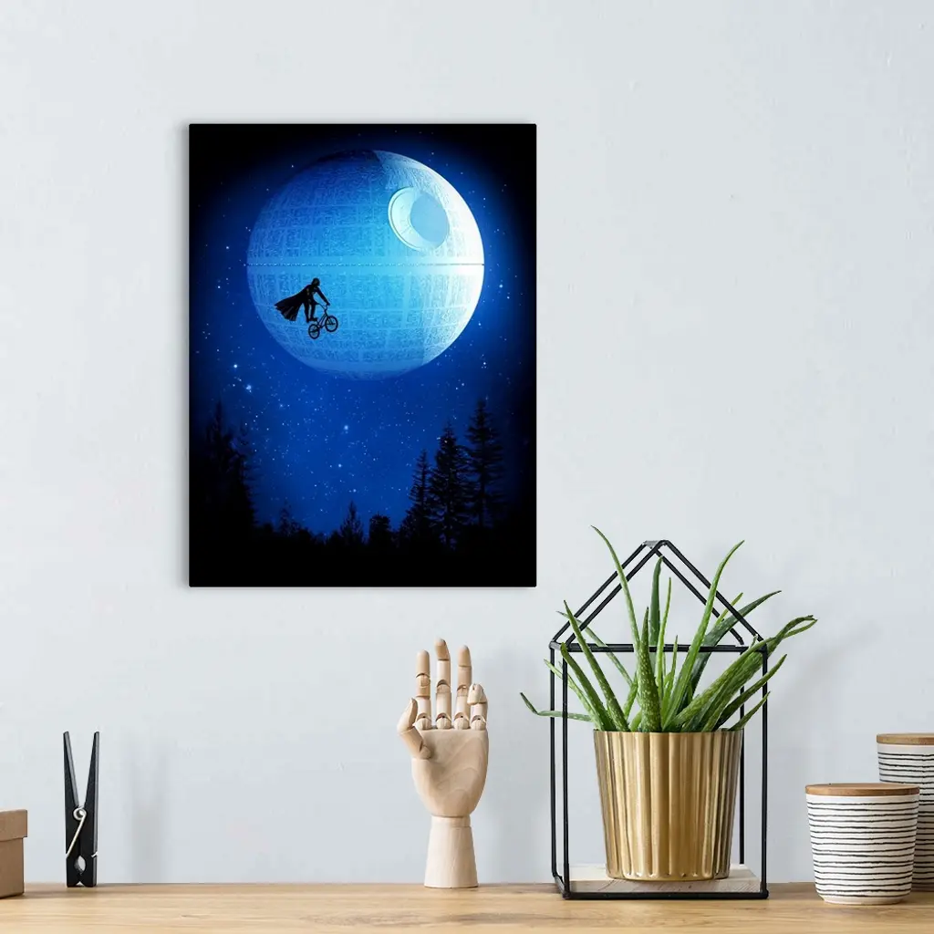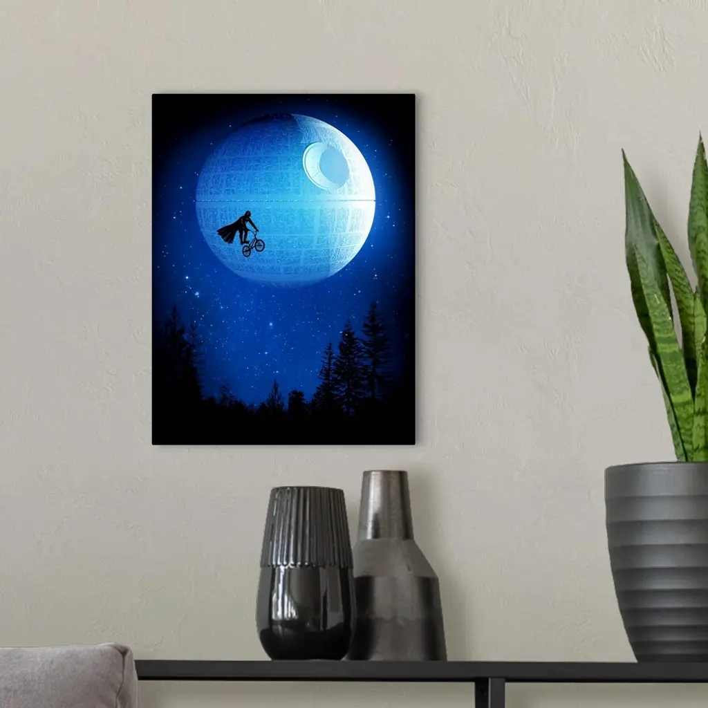 Pop art of Darth Vader on a bicycle in the sky in front of the Death Star.