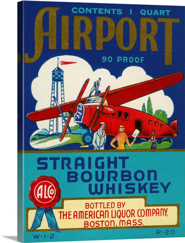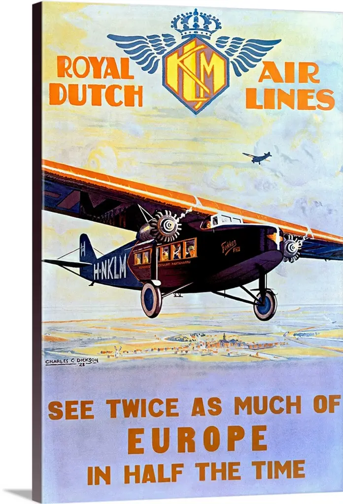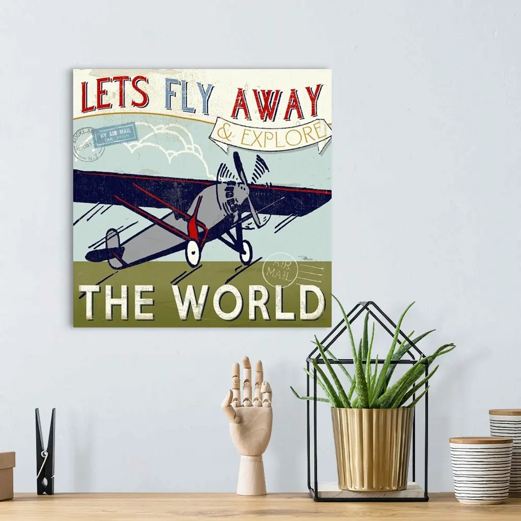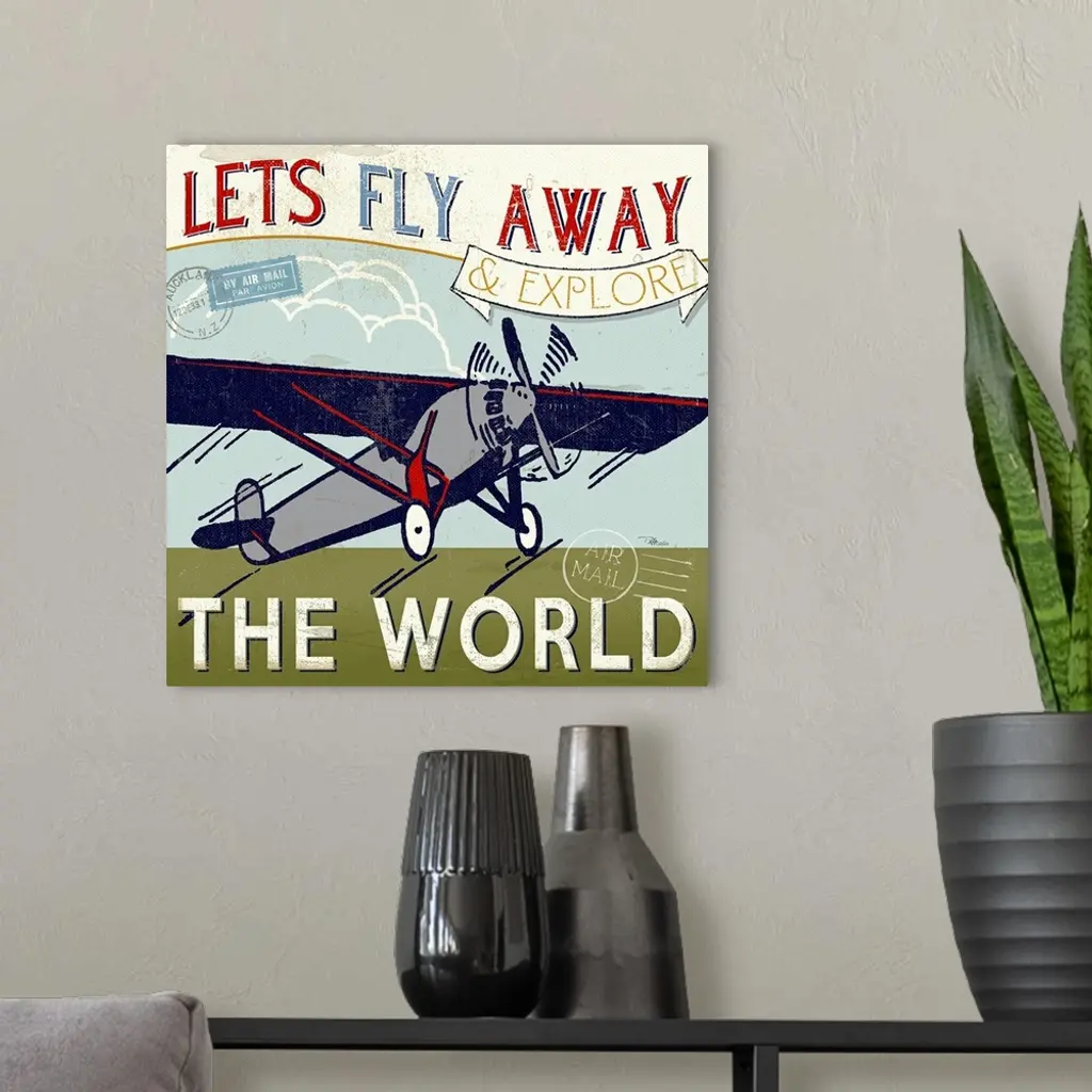 Retro-style graphic of a propeller plane taking off with airmail marks and the text "Let's fly away and explore the world."