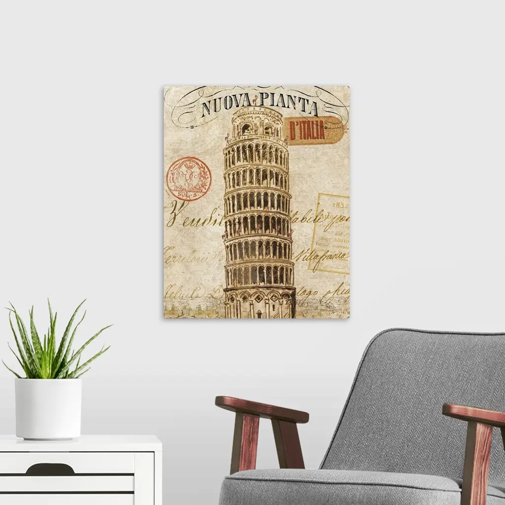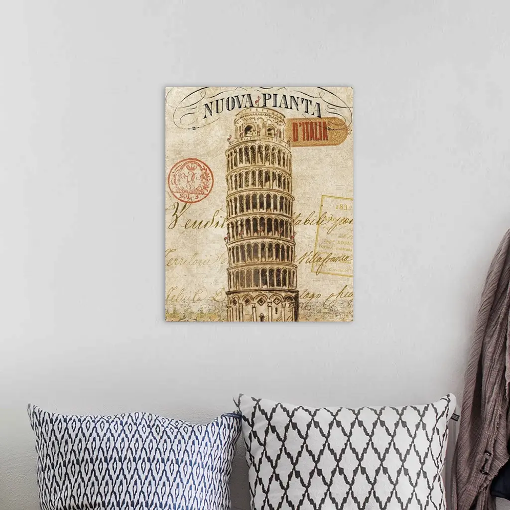 Wall docor featuring a vintage postcard design of the Leaning Tower of Pisa.