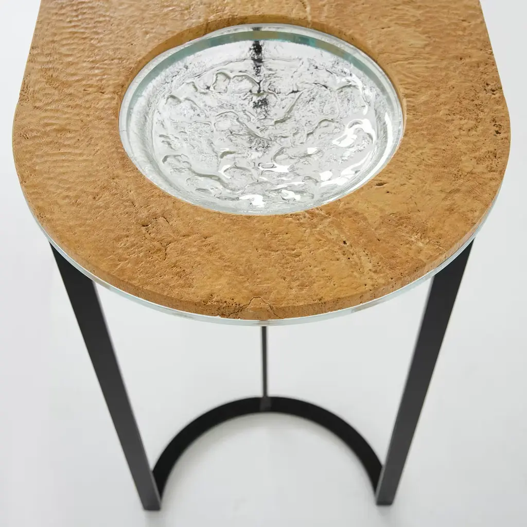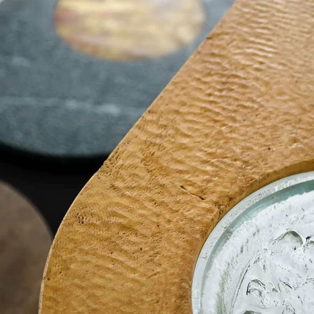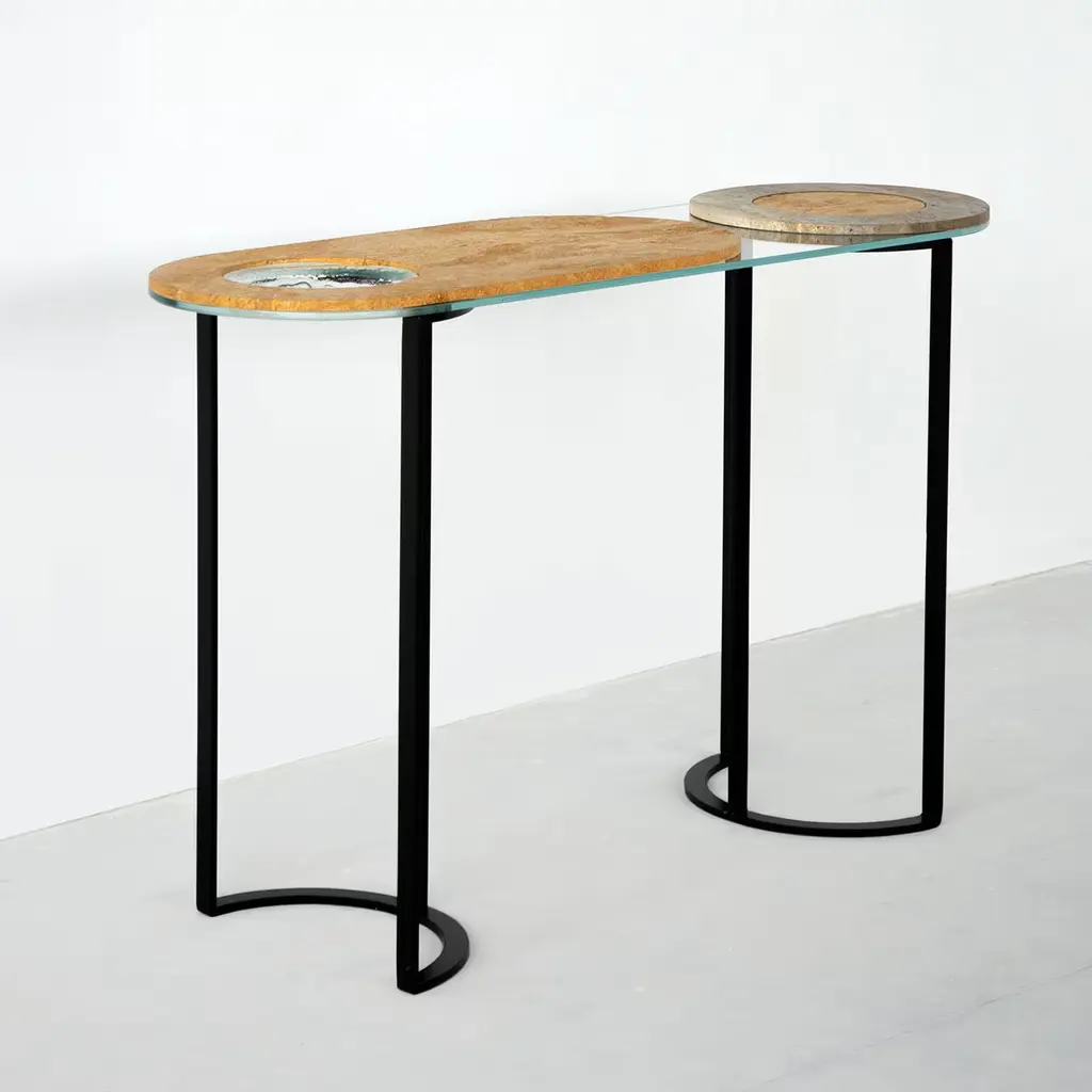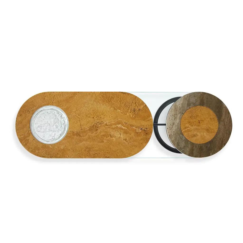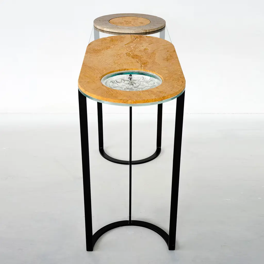 Lightness and essentiality of features, combined with the use of stones with a strong textural impact, is the hallmark of this console collection. The minimalism of the structures gives way to primary tactile materials. The bush-hammered processing of natural stones gives an extremely natural appearance to the materials, which is sure to have a scenic impact.