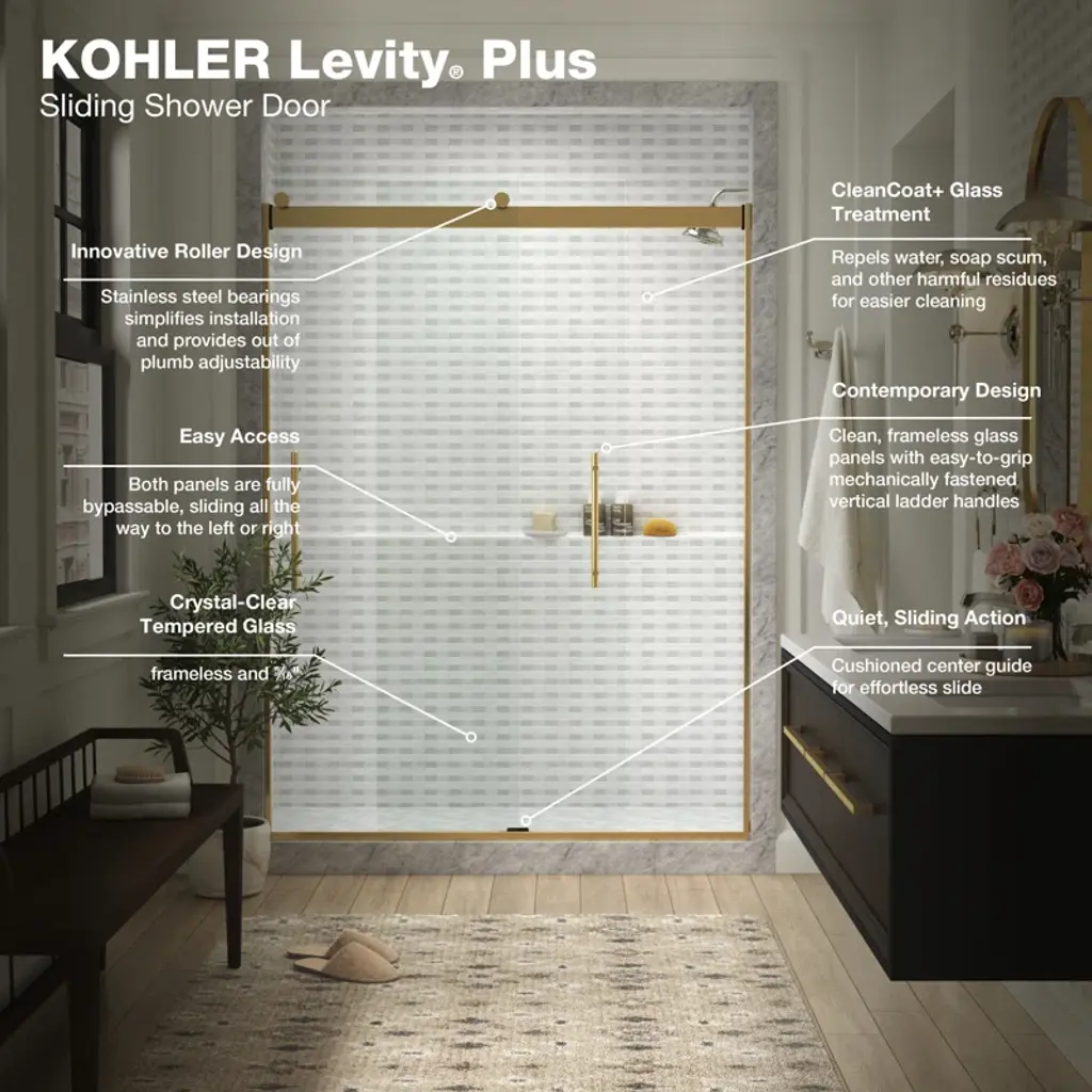 Bringing new technology and sleek style to the contemporary bathroom, Levity Plus shower doors feature an innovative roller design that provides an amazingly smooth, quiet sliding action for a difference you can feel. Fully bypassable glass panels make installation easier than ever and allow for adjustability while the door is hanging. Vertical blade handles complement the modern minimalist look, creating an open, inviting space for showering. Premium 5/16 in.-thick Crystal Clear glass offers a luxurious feel.