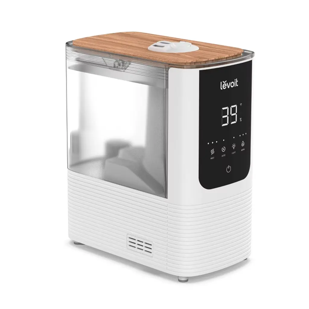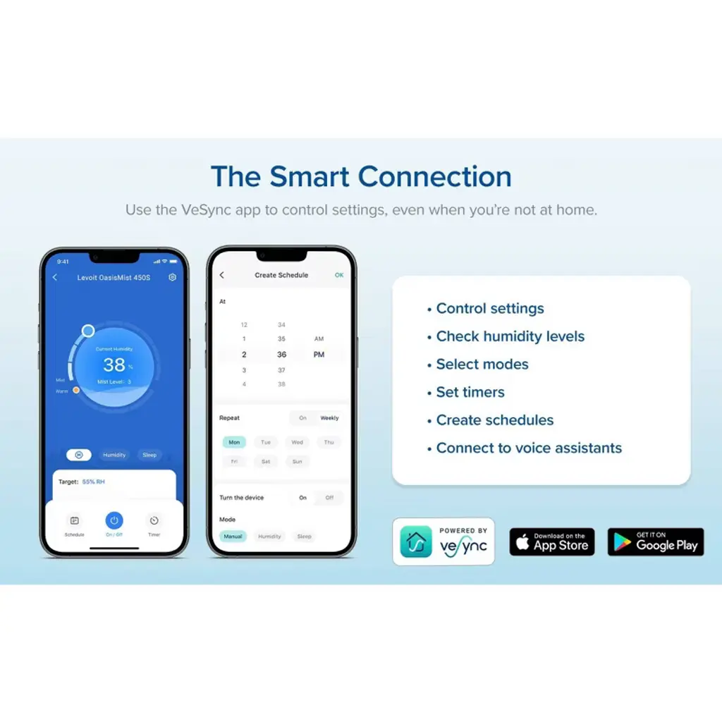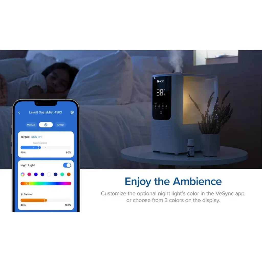 The Levoit OasisMist 450S Smart Humidifier helps you thrive throughout the changing seasons with warm and cool mist. Equipped with humidity sensors, the Levoit OasisMist gives you real-time humidity updates and automatically adjusts mist levels for you to maintain your target humidity percentage. Control settings, connect to third-party voice assistants, create schedules, customize the ambient light, and more with the free VeSync app. You can also enjoy continuous humidity in a 215–430 sq ft room for up to 45 hours before refilling the large, 1.19 gal / 4.5 L top-fill tank.
