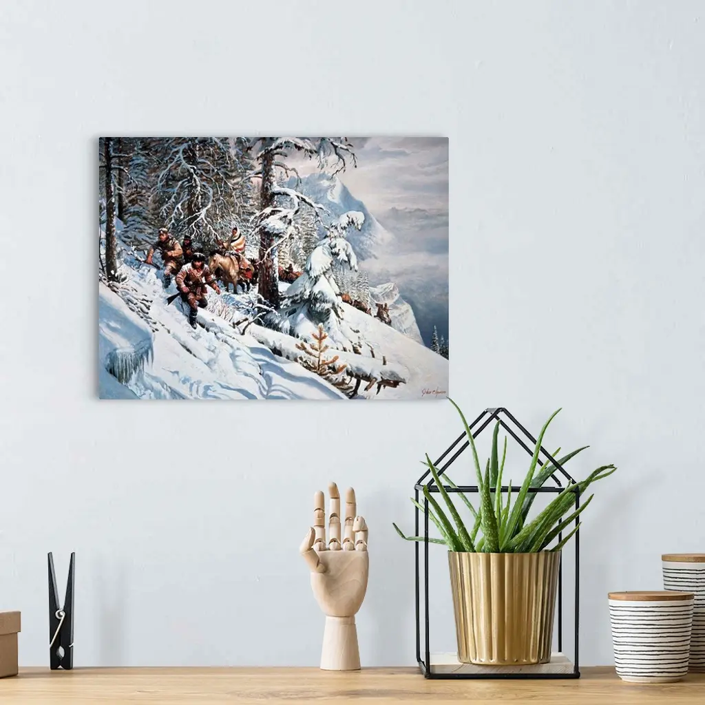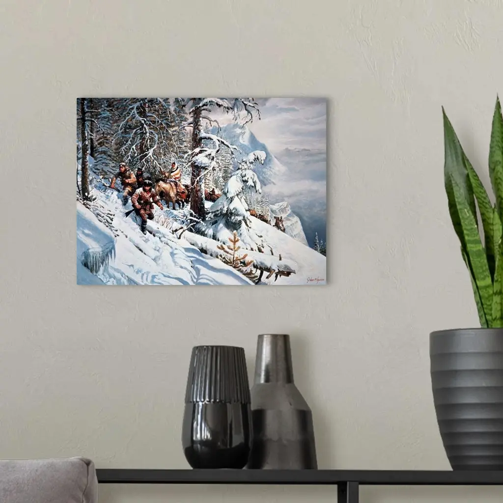 Lewis and Clark, with their guide Sacagawea (on horseback), in the Bitterroot Mountains in present-day Idaho, September 1805. Oil on canvas, 1967, by John Clymer.