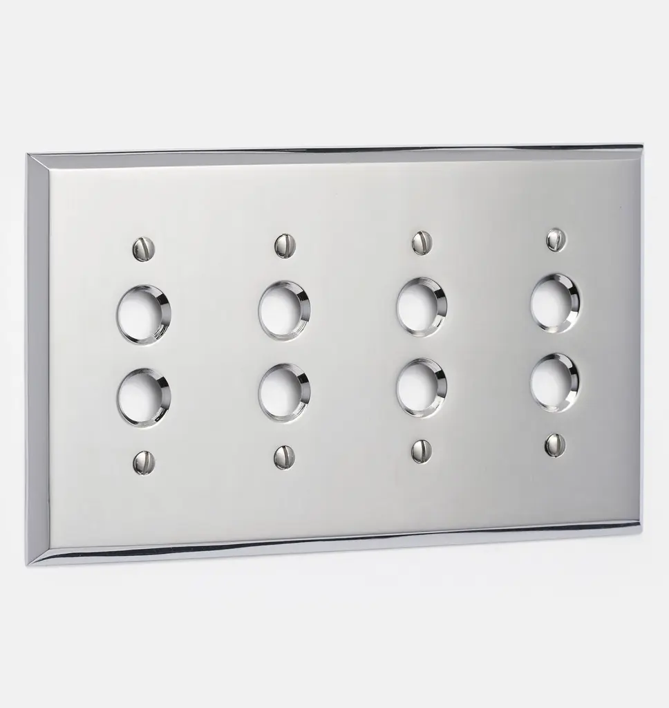Boasting a slim profile and beveled edges, our Lewis Double Push-Button Switchplate is available in several finishes, making it great for rewiring or remodeling projects. Crafted with durable hot-forged brass, this handsome and functional double toggle option allows control of two fixtures from one location.