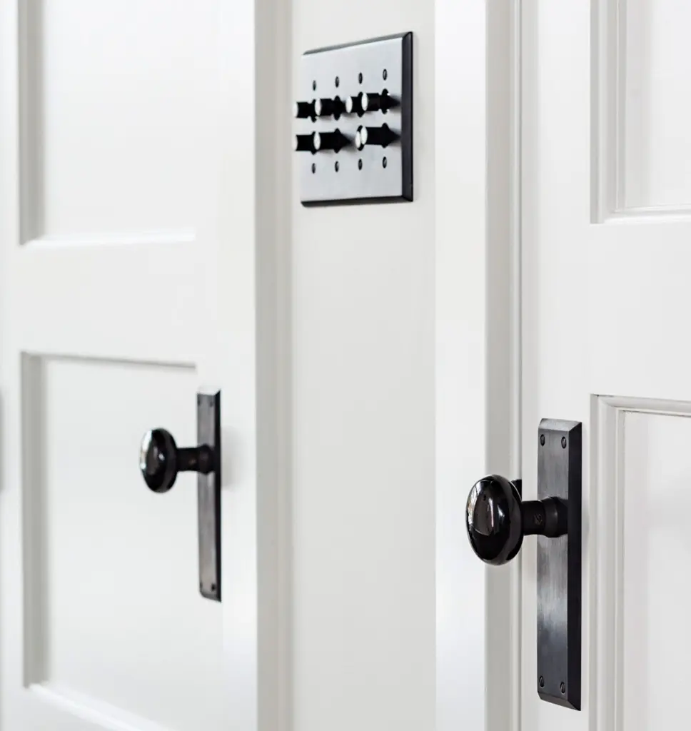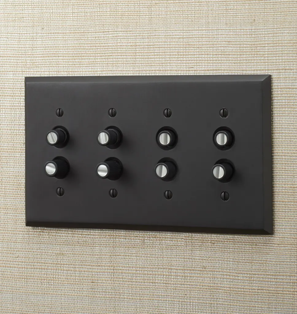 Boasting a slim profile and beveled edges, our Lewis Quad Push-Button Coverplate is available in several finishes, making it great for rewiring or remodeling projects. This quad push-button switchplate is ideal for places needing switches for multiple lights in the same place. Crafted with durable hot-forged brass, it features time-honored craftsmanship with the functionality of today's designs.