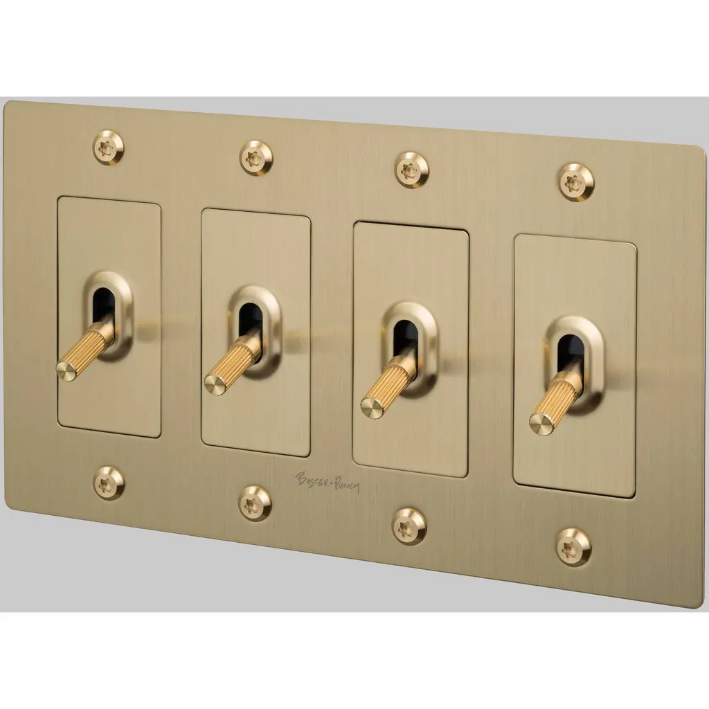 Boasting a slim profile and beveled edges, our Lewis Quad Toggle Coverplate is available in several finishes, making it great for rewiring or remodeling projects. Solid-brass construction recalls the craftsmanship of an earlier age, with all the functionality of today's designs.