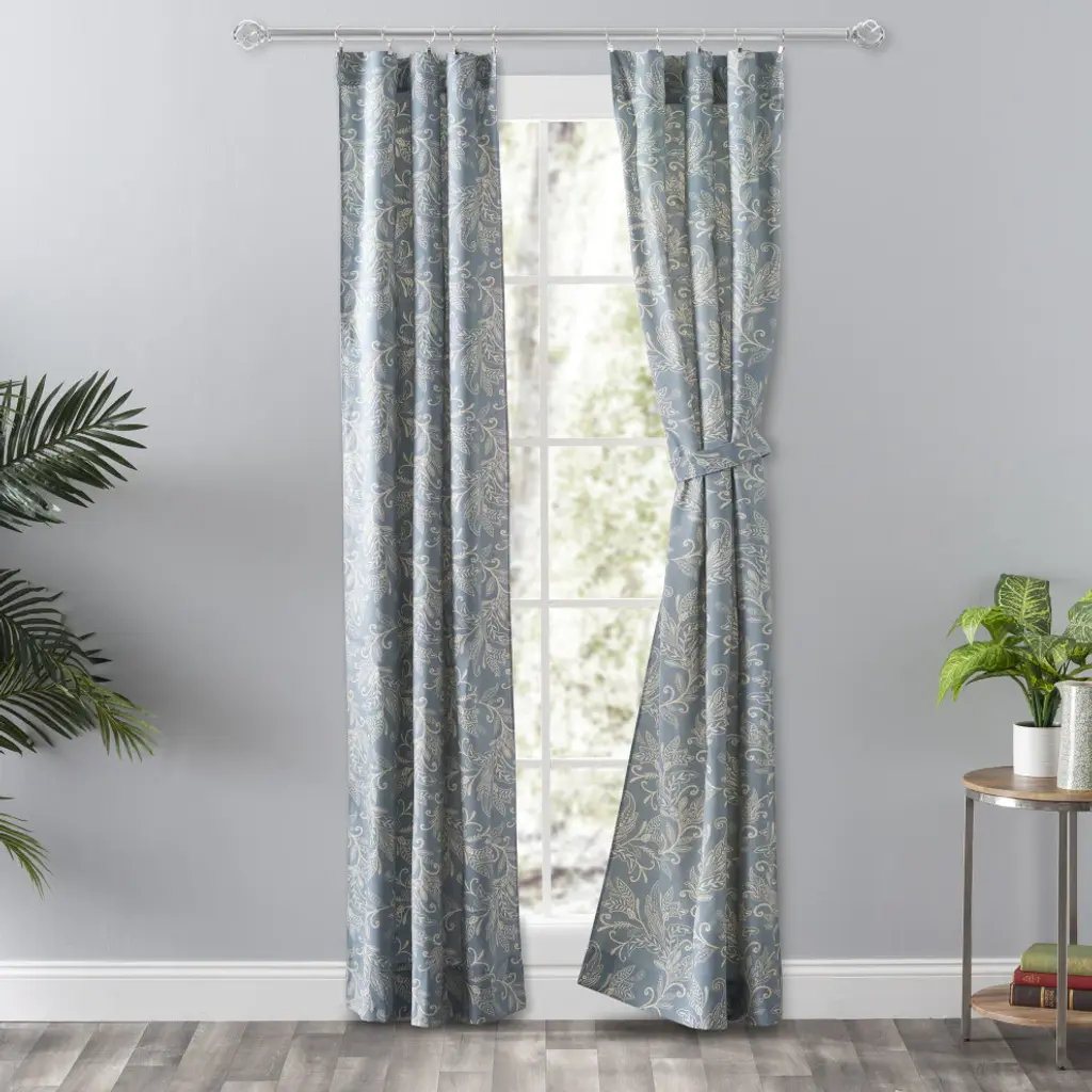 A swirling candlewick design is both relaxed and refined. The tailored panel pair ismade with 50-percent polyester/50-percent cotton duck fabric that creates a smooth draping effect, soft texture and easy maintenance. Each curtain panel is constructed with a 1.5-inch header and 1.5-inch rod pocket. Two tiebacks are included for a different look. Width is measured overall 56-inches (both 28-inch panels together), while length is measured at 84-inches. For wider windows simply add multiply panels together. Easy care machine washable.