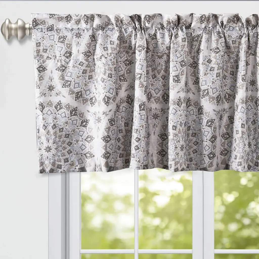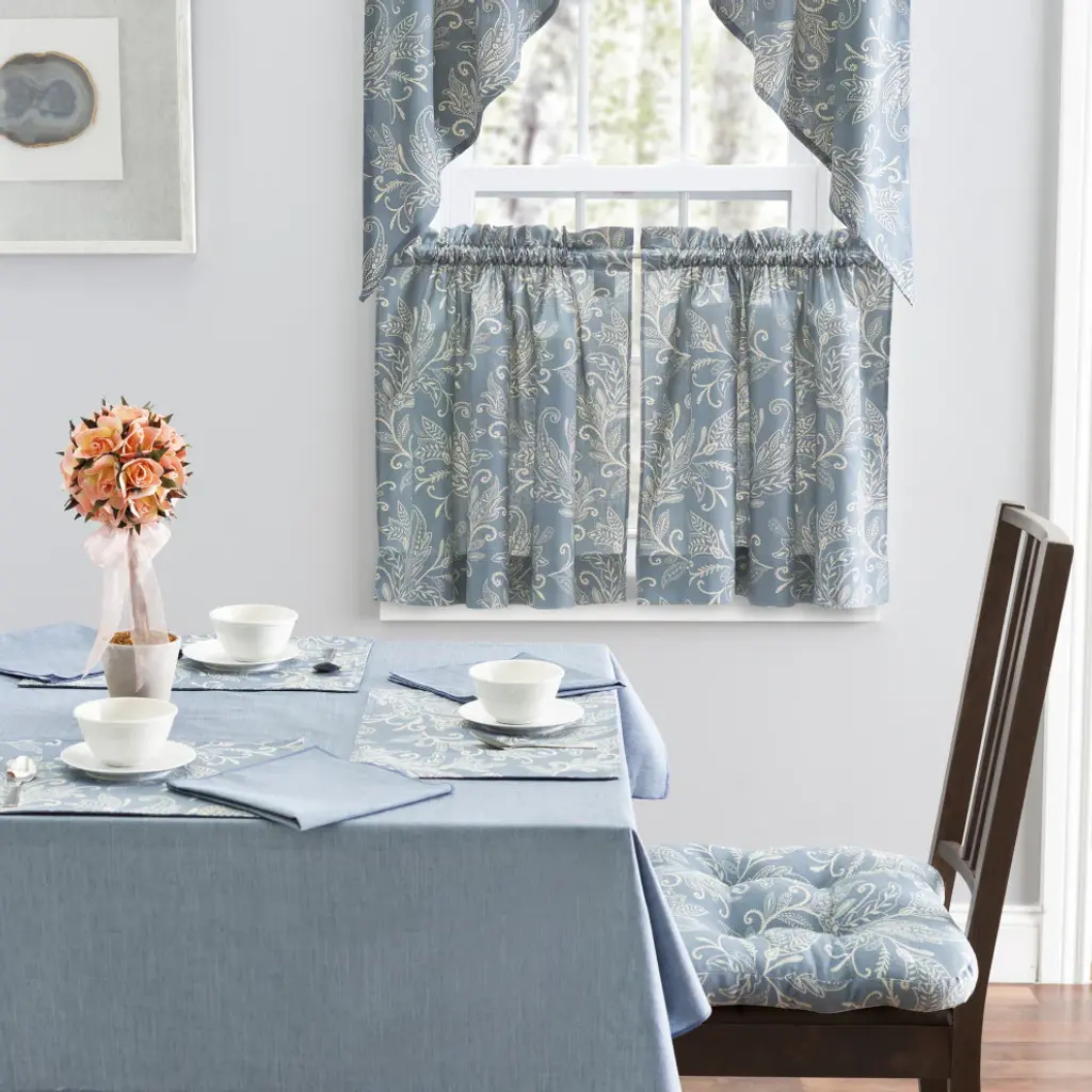 A swirling candlewick design is both relaxed and refined. Made with 50-percent polyester/50-percent cotton duck fabric that creates a smooth draping effect, soft texture and easy maintenance. Tailored Tier curtains are used to cover the lower portion of your windows or used alone on shorter length windows. Each curtain panel is constructed with a 1.5-inch header and 1.5-inch rod pocket. Sold in pairs (2 panels) width measures 56-inches (both 28-inch panels together), while length measures 24-inches from top stitch down. For wider windows add multiply panels together. Easy care machine washable.