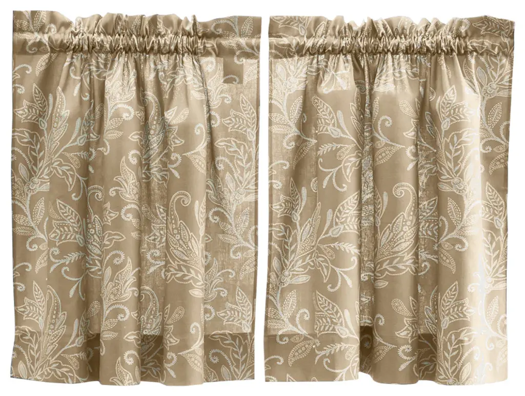 A swirling candlewick design is both relaxed and refined. Made with 50-percent polyester/50-percent cotton duck fabric that creates a smooth draping effect, soft texture and easy maintenance. Tailored Tier curtains are used to cover the lower portion of your windows or used alone on shorter length windows. Each curtain panel is constructed with a 1.5-inch header and 1.5-inch rod pocket. Sold in pairs (2 panels) width measures 56-inches (both 28-inch panels together), while length measures 36-inches from top stitch down. For wider windows add multiply panels together. Easy care machine washable.