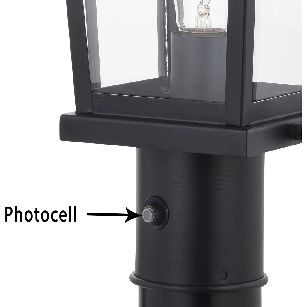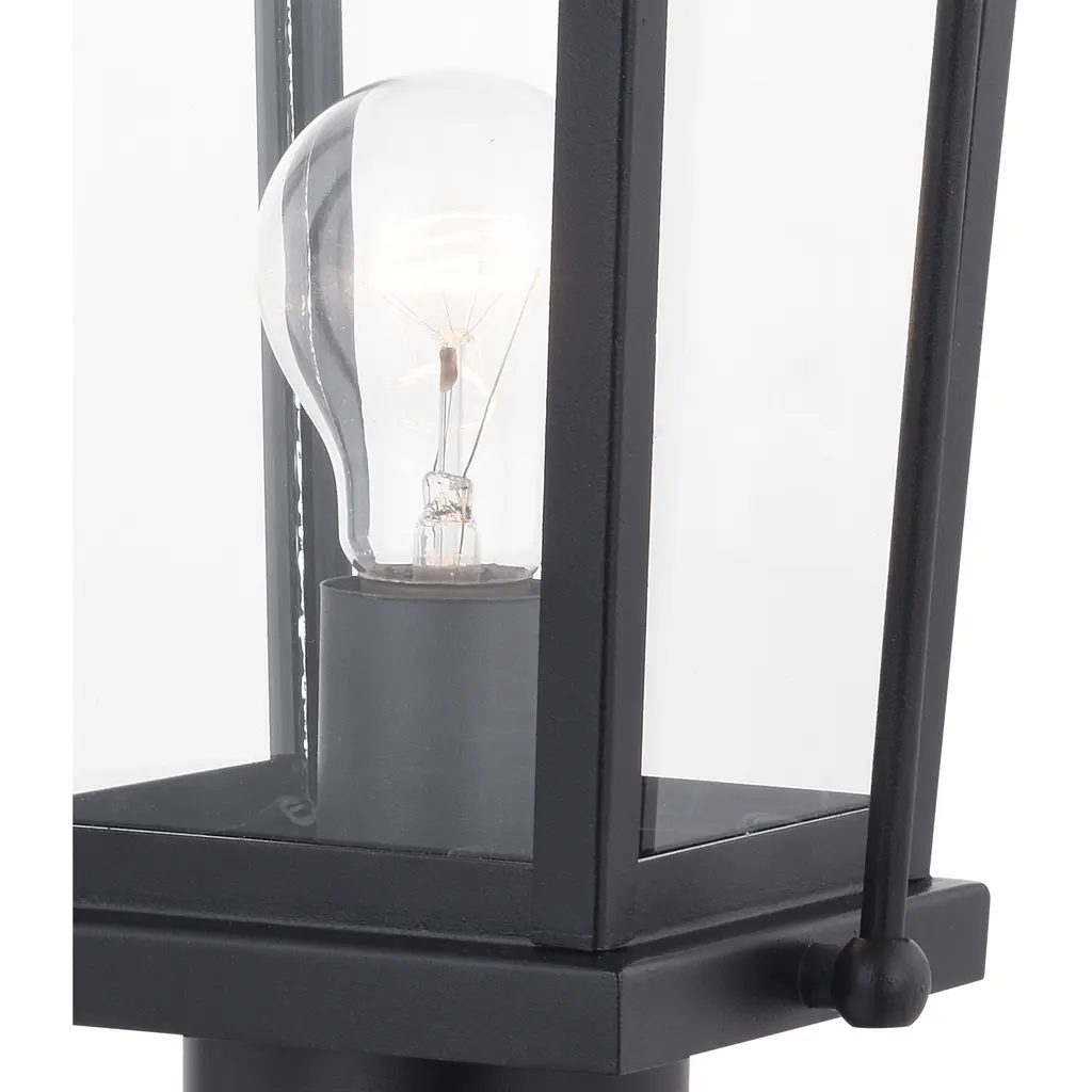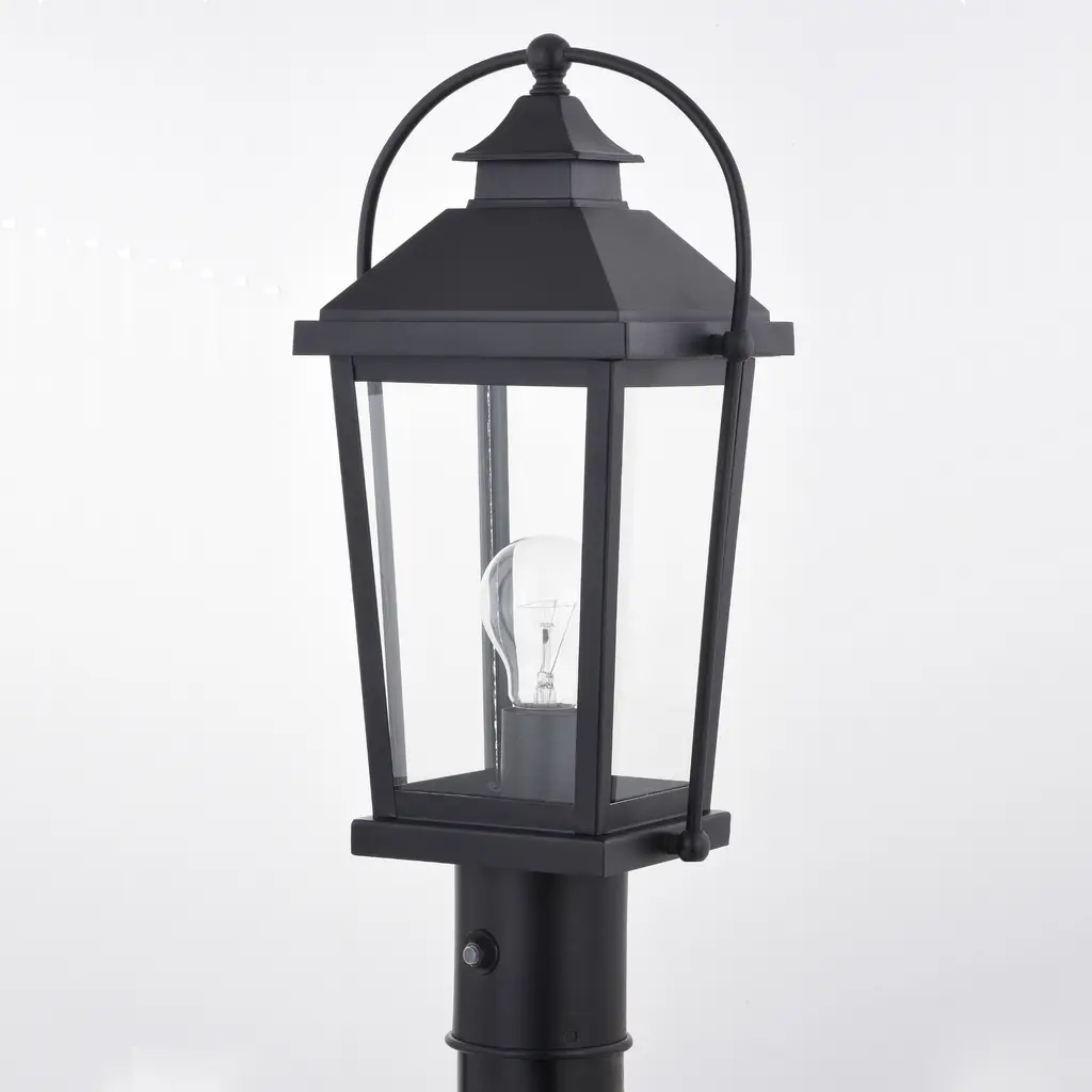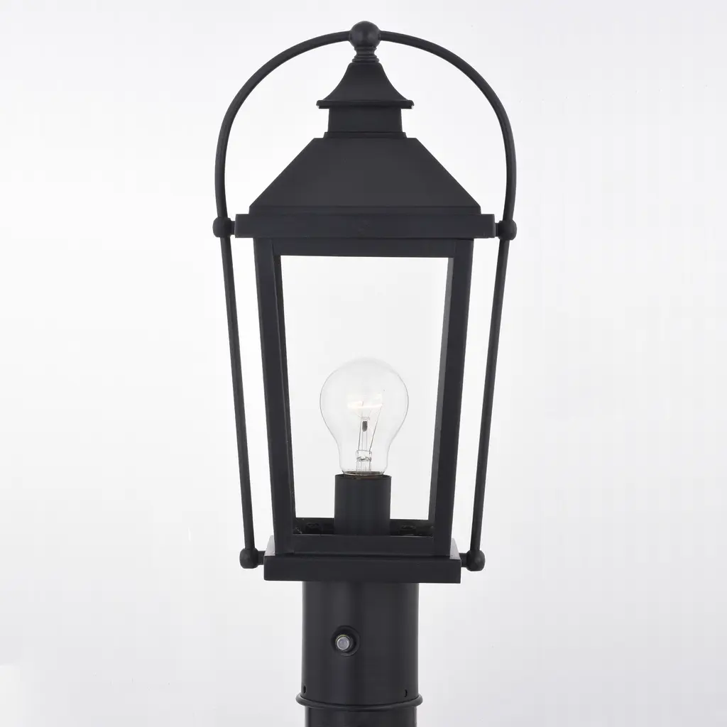 The colonial inspired Lexington collection is steeped in traditional charm. A textured black finish coupled with tapered, clear glass panels are further enhanced with a curved metal lantern handle creating a carriage house lantern look. Combine that with vintage Edison style filament bulbs to complete the look. This post light mounts on a 3-inch diameter post (not included). Ideal for illuminating your yard, driveway, or any other area of your home.