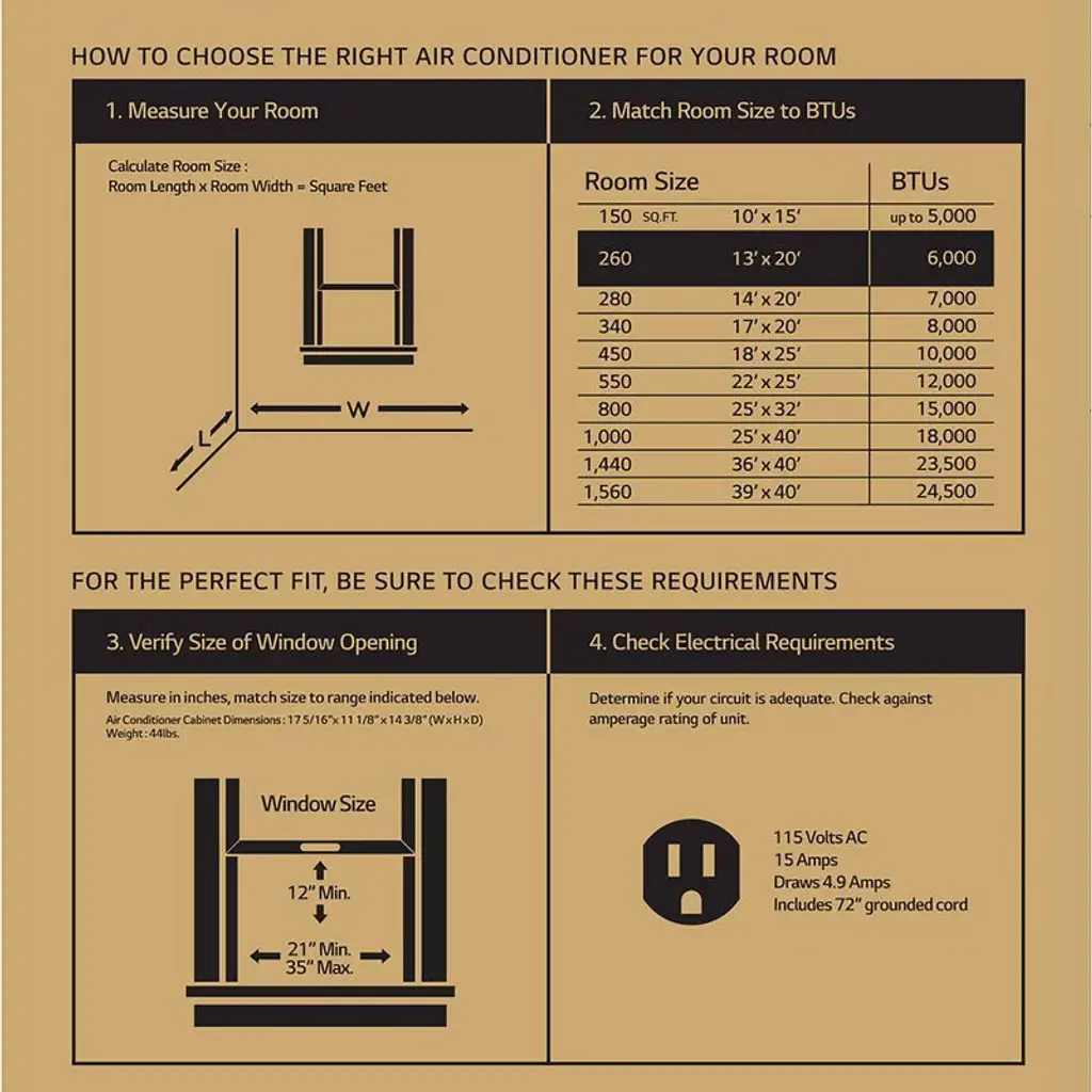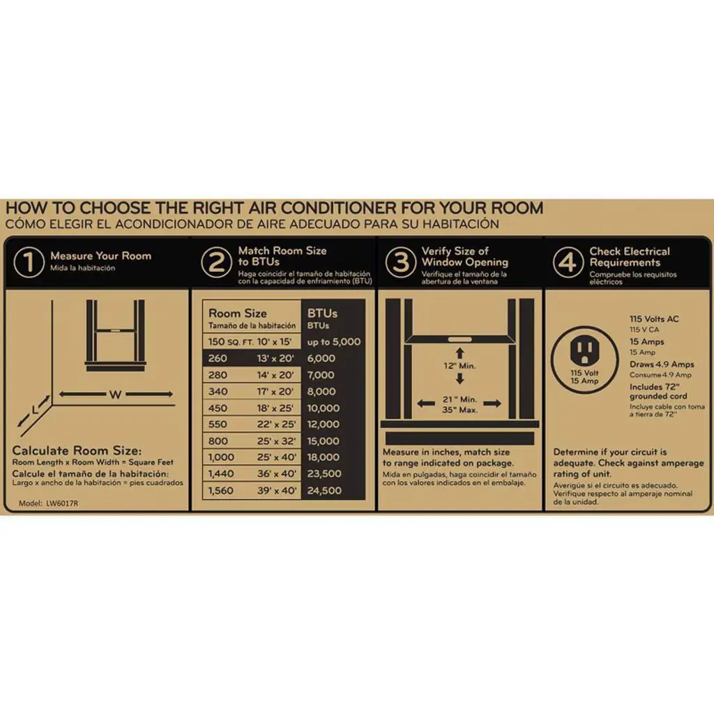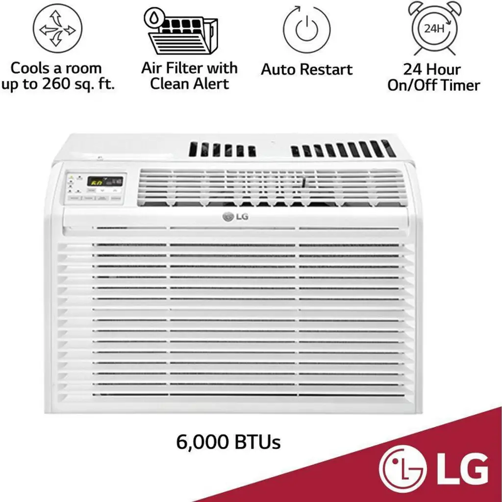 It’s important to get the right air conditioner for the job! The LG LW6017R is ideal for cooling medium rooms up to 250 sq. ft. This unit has 3 cooling and fan speeds and a 24 hour timer to create a cooling schedule. 2-way air deflection lets the flow of air be directed where it's needed most whether cooling, dehumidifying or just circulating air. If there is a power outage, the auto restart feature will automatically turn your unit back on when power is restored. Other features include a remote control, easy window installation kit, removable, washable filter and a check filter alert.