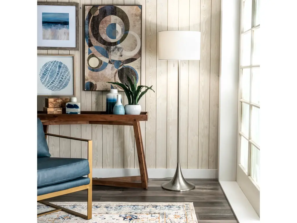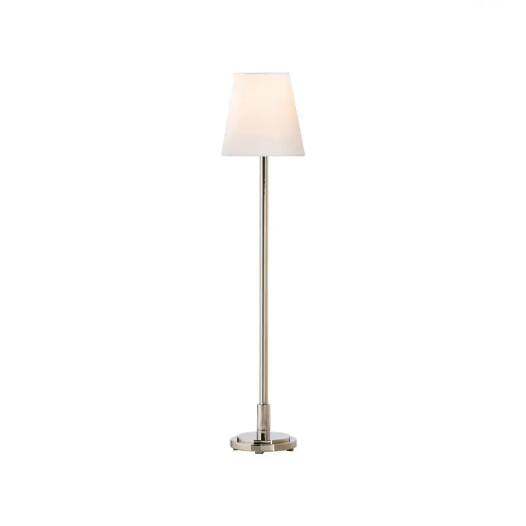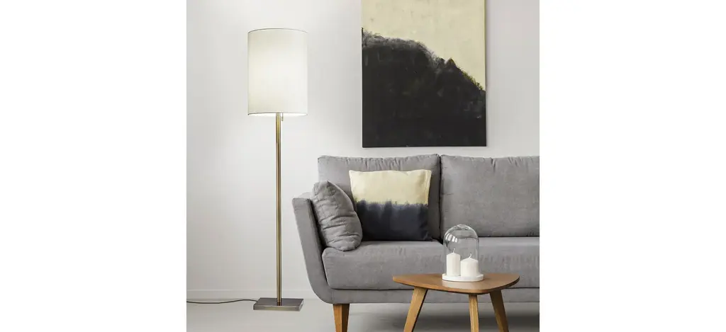 The Liam Floor Lamp is an elegant style that highlights simple materials and a classic silhouette. A thick antique brass metal pole supports a light beige textured fabric shade. A tall cylinder shade is contrasted by a compact square shaped metal base. A simple pull chain turns the lamp on and off. A subtle clear cord trails out from the base. Place this floor lamp in your living room for a soft, modern look.