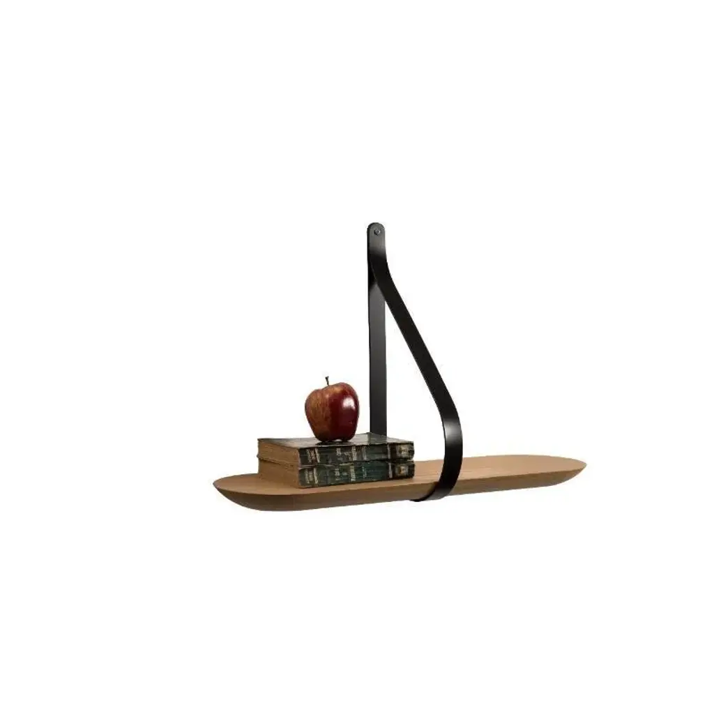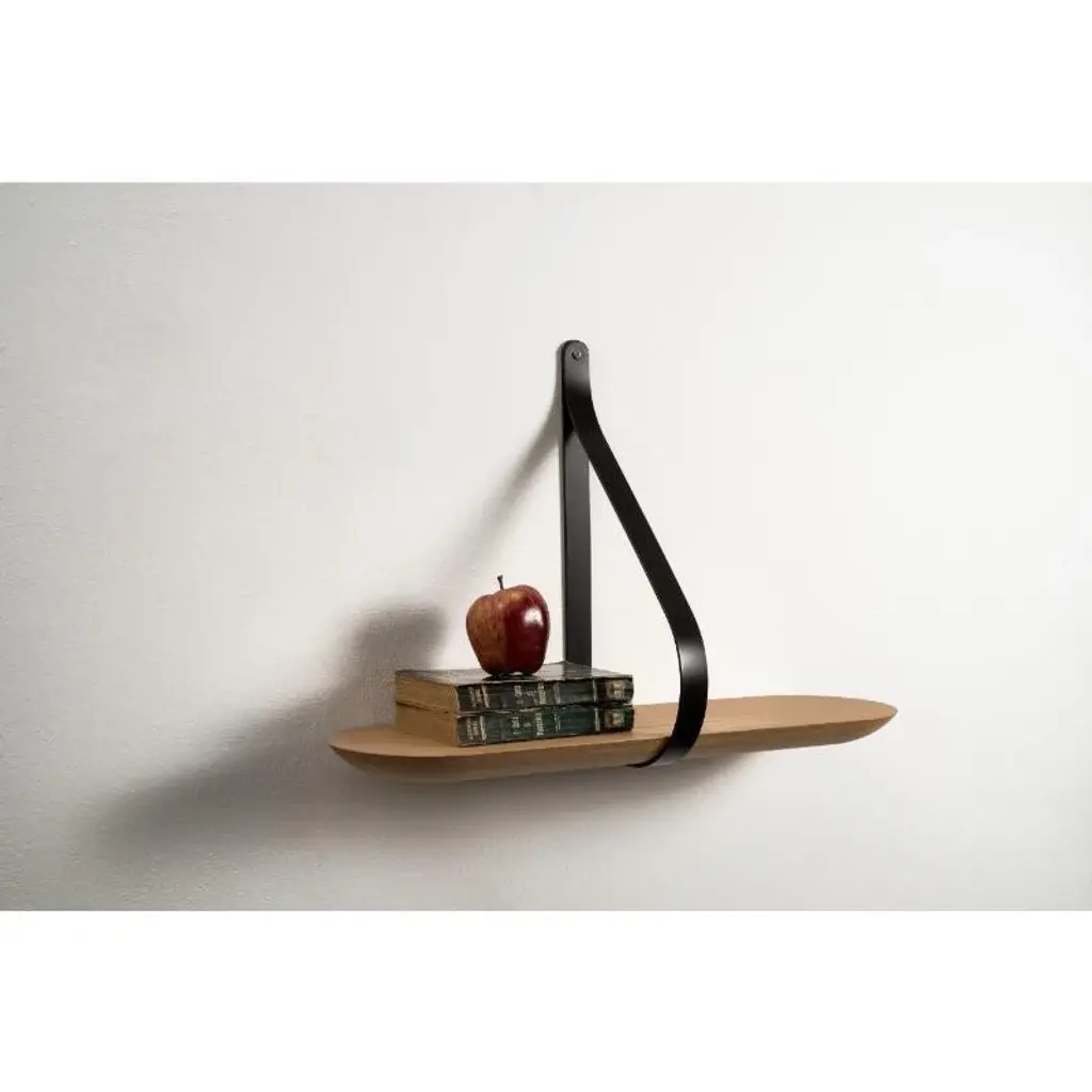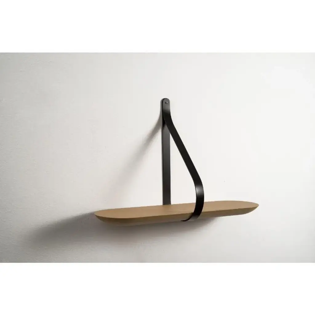 Set of 2, libra shelves 60 & 120 by colé italia with martinelli/venezia dimensions: h.42 d.20 w.55 cm (l60), h.42 p.20 w.124 (l120) cm materials: shaped solid oak wall shelf; black lacquered iron stirrups also available: libra shelf 60, 120. A minimalist shape with a strong aesthetic, libra plays with the concept of balance, displacing the observer. “the metal support wraps the convex base of the wood, deforming and creating a material illusion: at first impression, it resembles a leather band. The image that inspired the project is, in fact, the traditional book-holder leather belt used by our grandparents, before the advent of the folders. Made of solid oak and supported by a wrought iron ribbon. A hidden metal plate welded to the support structure, makes the shelf-stable and durable.