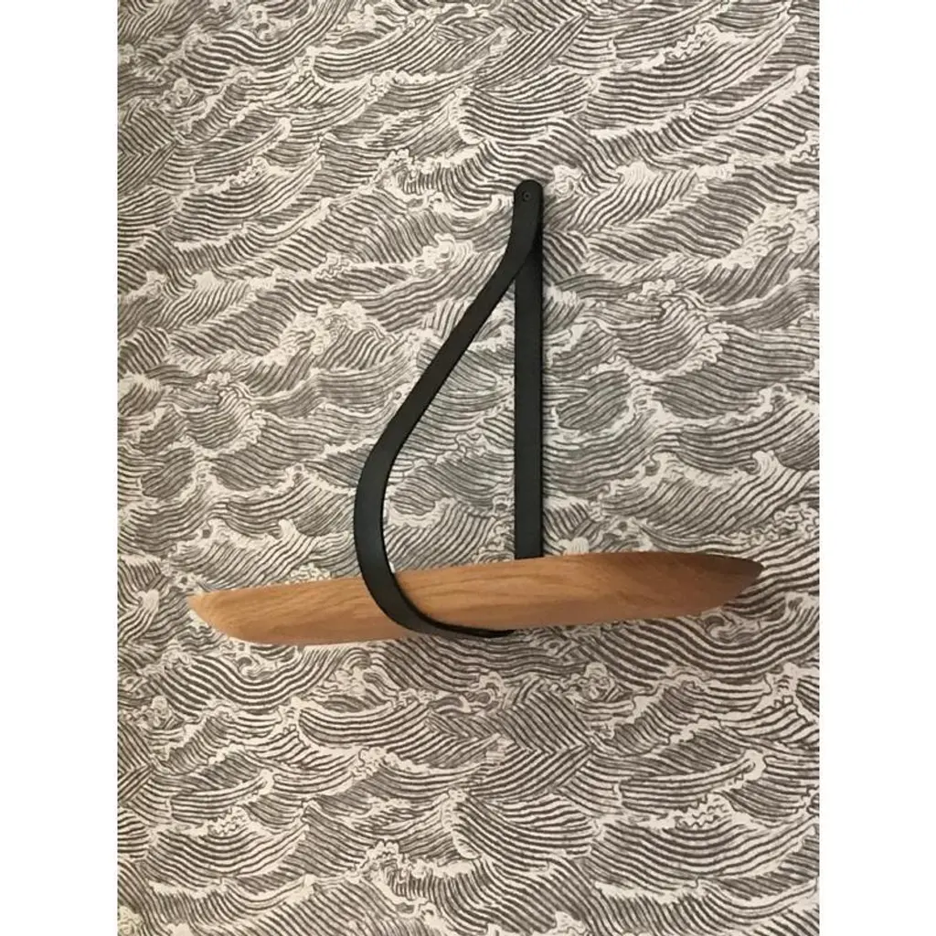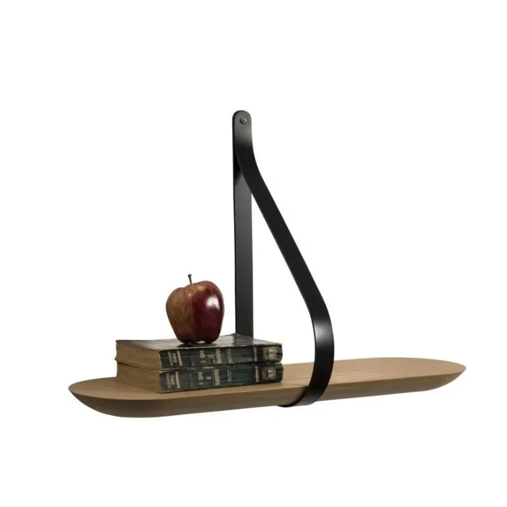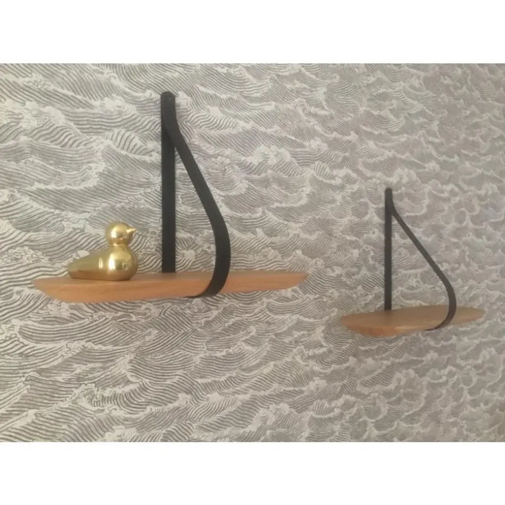 Set of 2, libra shelves 60 & 120 by colé italia with martinelli/venezia dimensions: h.42 d.20 w.55 cm (l60), h.42 p.20 w.124 (l120) cm materials: shaped solid oak wall shelf; black lacquered iron stirrups also available: libra shelf 60, 120. A minimalist shape with a strong aesthetic, libra plays with the concept of balance, displacing the observer. “the metal support wraps the convex base of the wood, deforming and creating a material illusion: at first impression, it resembles a leather band. The image that inspired the project is, in fact, the traditional book-holder leather belt used by our grandparents, before the advent of the folders. Made of solid oak and supported by a wrought iron ribbon. A hidden metal plate welded to the support structure, makes the shelf-stable and durable.