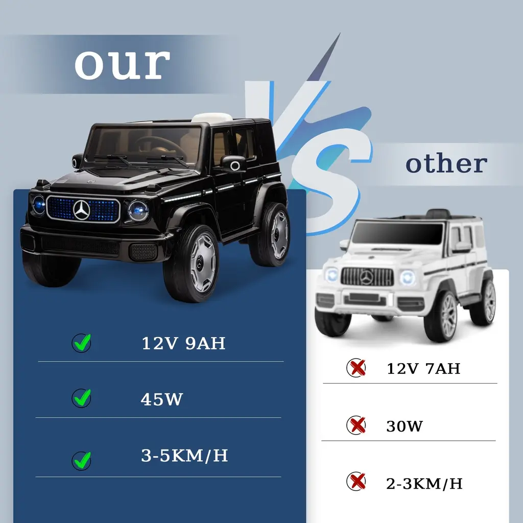Officially Licensed Mercedes-Benz EQG Design: This ride-on car is officially licensed and boasts an authentic design modeled after the iconic Mercedes-Benz EQG. It includes realistic features such as functional full car lighting, a responsive steering wheel, and a foot pedal, offering kids an immersive driving experience.Impressive Performance and Playtime: The Heoy kids' electric car is powered by dual high-performance motors and a 12V rechargeable battery, providing up to 60 minutes of playtime on a full charge. With a top speed of 4.0 mph, the treaded wheels ensure excellent grip, making it suitable for various terrains like grass and asphalt.Engaging Features for Kids: Designed for young adventurers eager to drive, this ride-on vehicle includes realistic elements such as headlights, a horn, engine sounds, and pedal acceleration. It also features built-in songs and supports USB or Bluetooth connectivity to let kids enjoy their favorite tunes while driving.Dual Control Options: The electric car offers two modes of operation for added fun. Kids can independently drive using the foot pedal and steering wheel or parents can take control with the included 2.4GHz remote control, providing a safe and enjoyable experience for younger children. (Note: 2 x 1.5V AAA batteries for the remote are not included.)Safety Features Prioritized: This ride-on car emphasizes safety with features like a power switch to prevent accidental startups, a safety belt for secure seating, and a soft start design to avoid sudden acceleration. Equipped with reliable spring suspensions, it provides a smooth ride while ensuring both safety and enjoyment for young drivers.