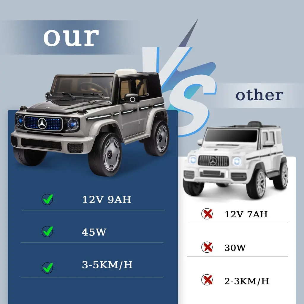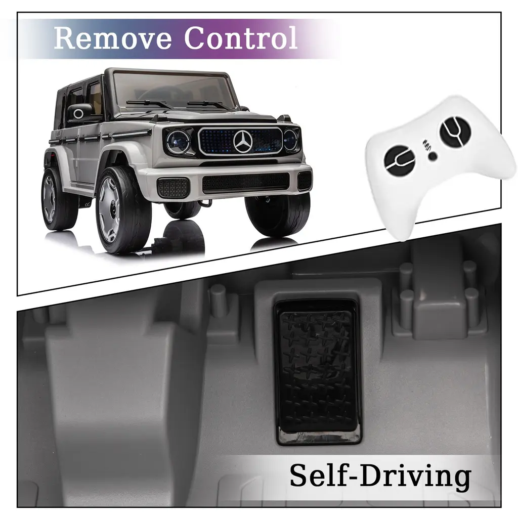 Officially Licensed Mercedes-Benz EQG Design: This ride-on car is officially licensed and boasts an authentic design modeled after the iconic Mercedes-Benz EQG. It includes realistic features such as functional full car lighting, a responsive steering wheel, and a foot pedal, offering kids an immersive driving experience.Impressive Performance and Playtime: The Heoy kids' electric car is powered by dual high-performance motors and a 12V rechargeable battery, providing up to 60 minutes of playtime on a full charge. With a top speed of 4.0 mph, the treaded wheels ensure excellent grip, making it suitable for various terrains like grass and asphalt.Engaging Features for Kids: Designed for young adventurers eager to drive, this ride-on vehicle includes realistic elements such as headlights, a horn, engine sounds, and pedal acceleration. It also features built-in songs and supports USB or Bluetooth connectivity to let kids enjoy their favorite tunes while driving.Dual Control Options: The electric car offers two modes of operation for added fun. Kids can independently drive using the foot pedal and steering wheel or parents can take control with the included 2.4GHz remote control, providing a safe and enjoyable experience for younger children. (Note: 2 x 1.5V AAA batteries for the remote are not included.)Safety Features Prioritized: This ride-on car emphasizes safety with features like a power switch to prevent accidental startups, a safety belt for secure seating, and a soft start design to avoid sudden acceleration. Equipped with reliable spring suspensions, it provides a smooth ride while ensuring both safety and enjoyment for young drivers.