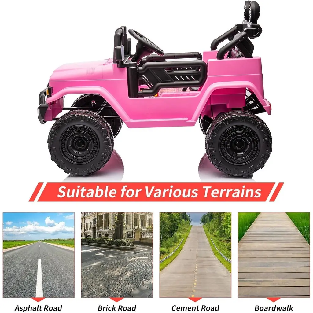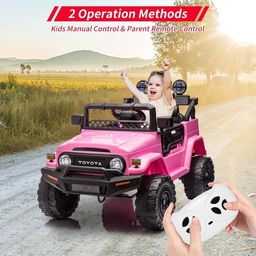 Powerful Performance----With a 12V 7AH rechargeable battery, this electric car allows kids to drive smoothly on various terrains like grass, gravel, and gentle inclines. Stylish Design----This licensed Toyota ride-on truck features realistic LED lights, wear-resistant EVA wheels, an MP3 player, and a flash drive port, along with fully opening doors for an authentic driving experience. Dual Driving Modes----Kids can drive using the foot pedal and steering wheel, or parents can control the car with a 2.4G remote that offers forward, reverse, and park options. Perfect Gift for Children----Measuring 38.6" x 25.6" x 26.6" and supporting up to 66lbs, this ride-on car features a roomy seat for added comfort, making it an ideal gift for children aged 3 and above. Safe & Durable----Made from sturdy materials meeting all child safety standards, this car has passed CPSIA, CPC, and ASTM-F963 certifications, ensuring a safe playtime experience.