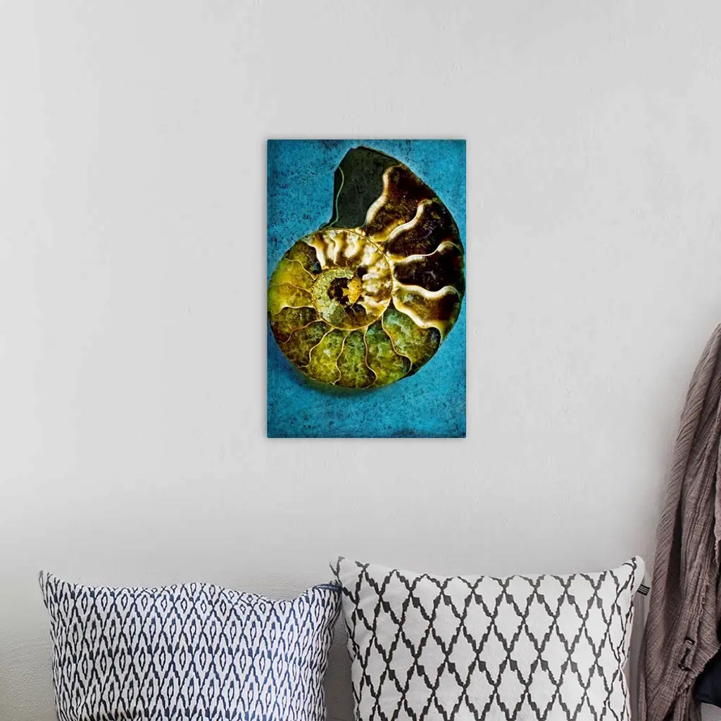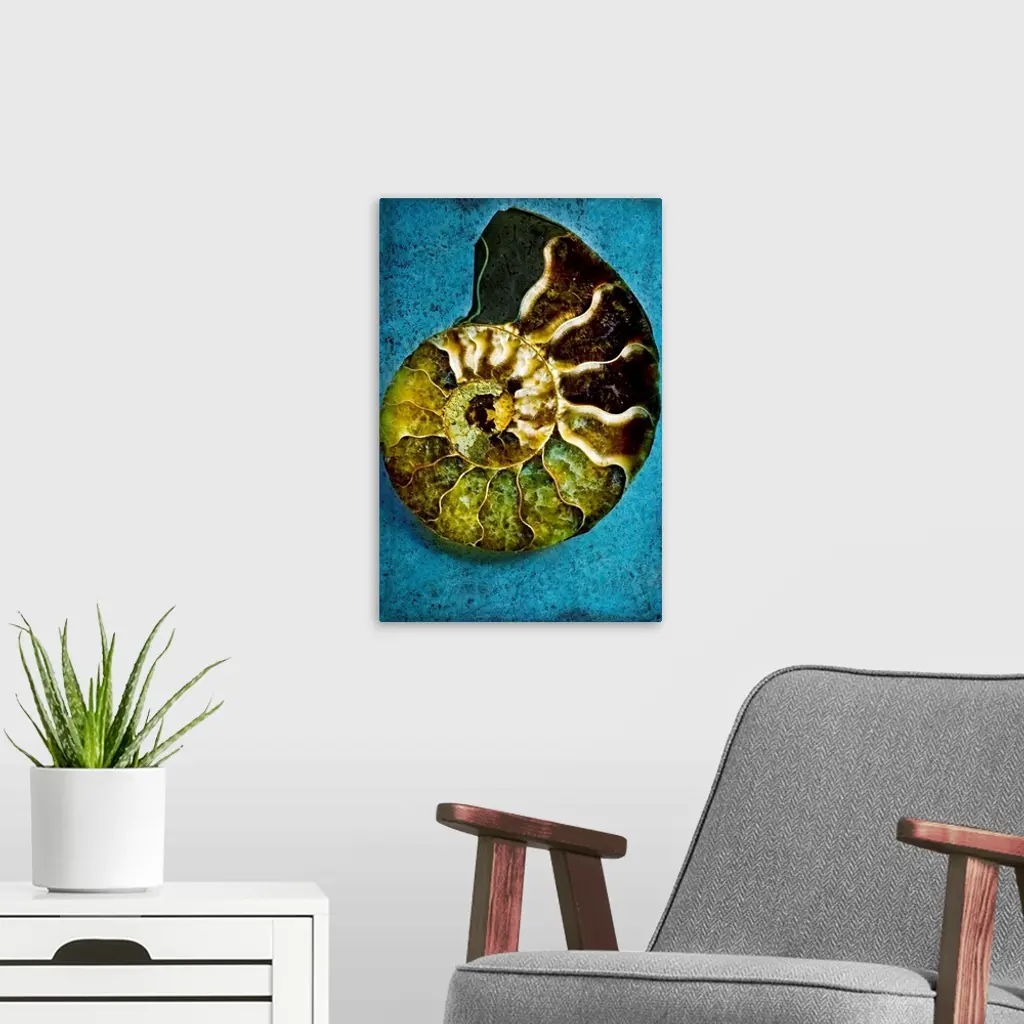 Decorative wall art for the home, office, or beach house this vertical photograph of a nautiluses shell has a painterly quality.