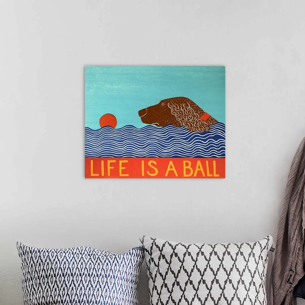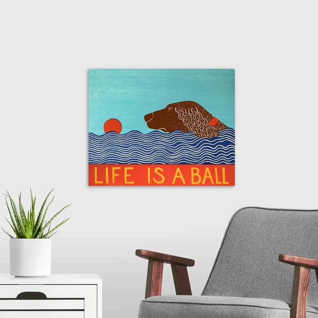 Illustration of a brown dog swimming to fetch a red ball in the water with the phrase "Life is a Ball" written on the bottom.