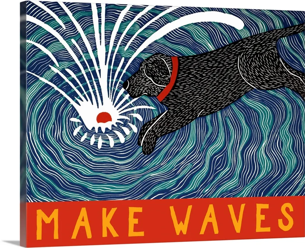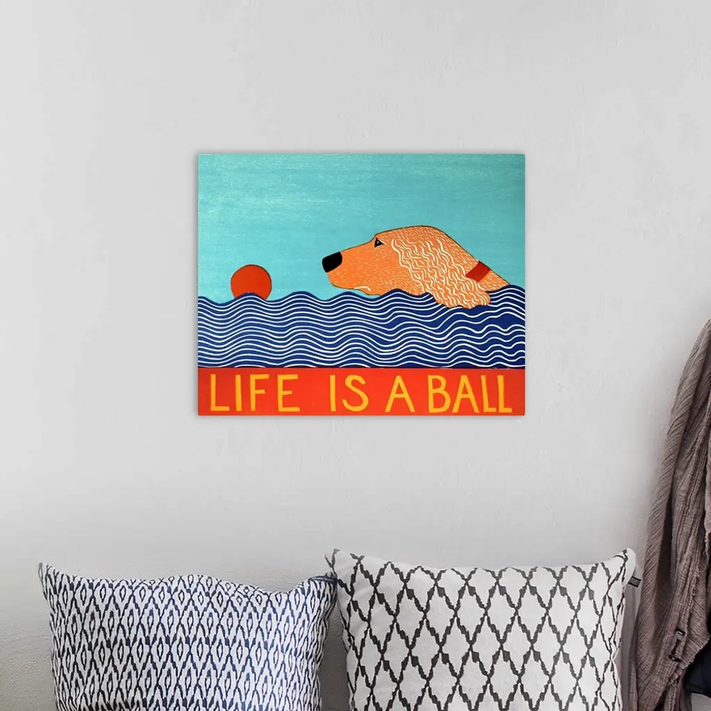 Illustration of a golden retriever swimming to fetch a red ball in the water with the phrase "Life is a Ball" written on the bottom.