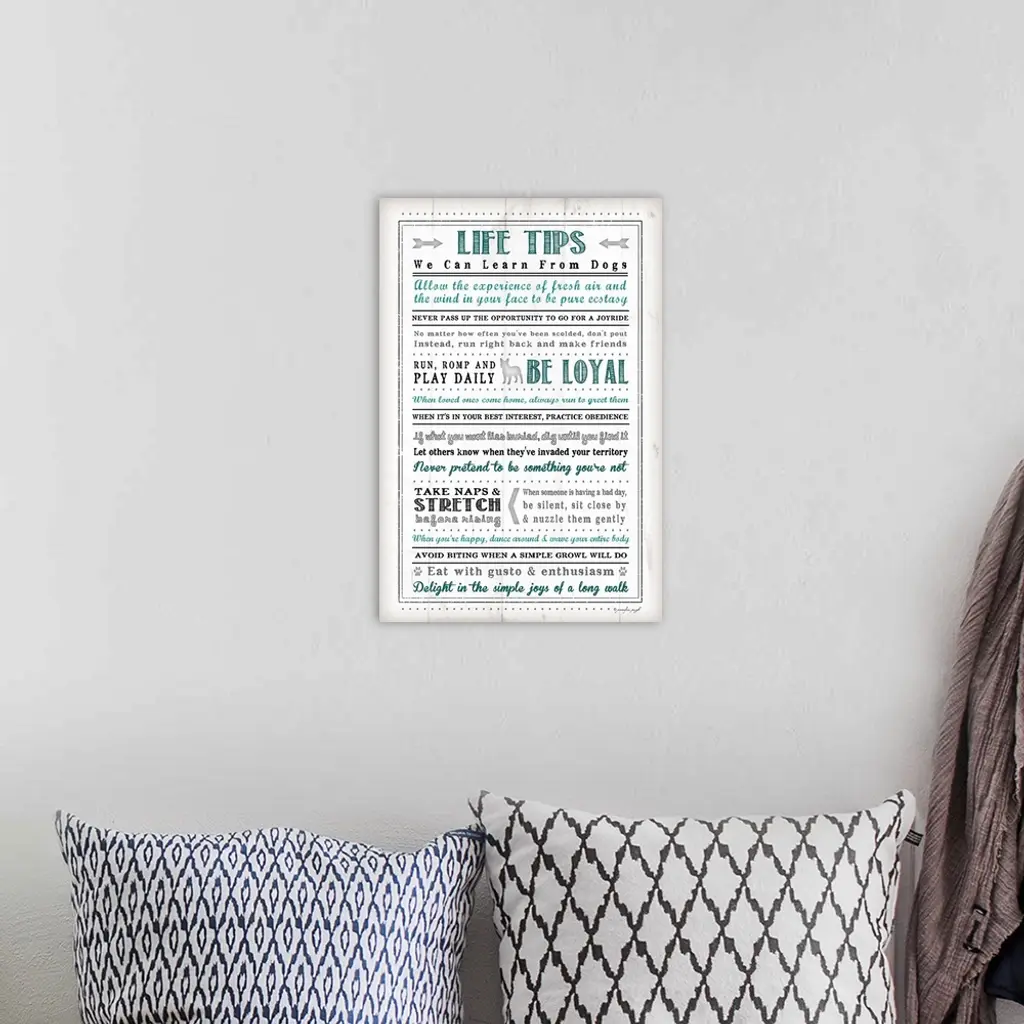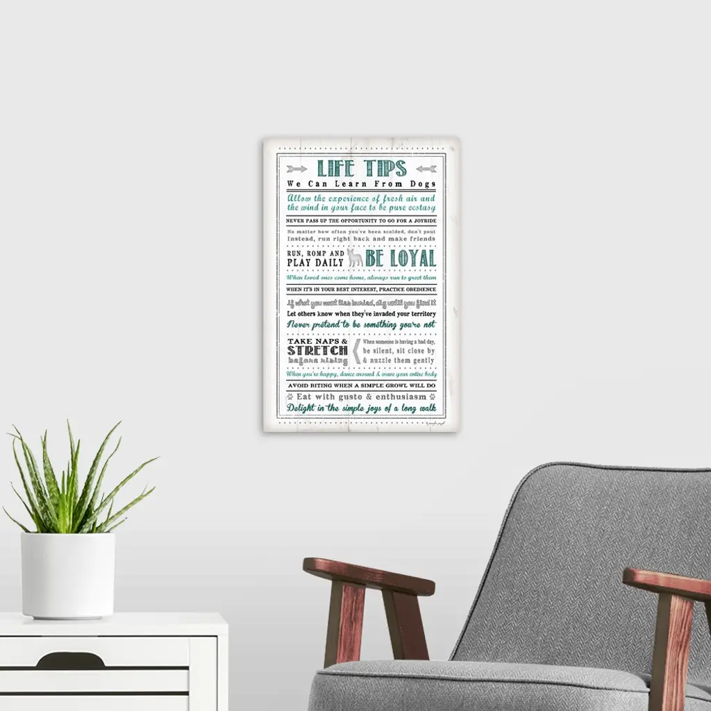 Written out life tips that we can learn from dogs in blue, grey, and black.