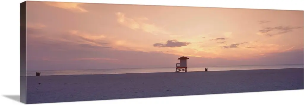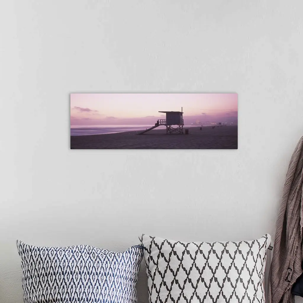 Long horizontal photo print of a lifeguard station on the beach along the Pacific ocean with the Santa Monica Pier in the background.