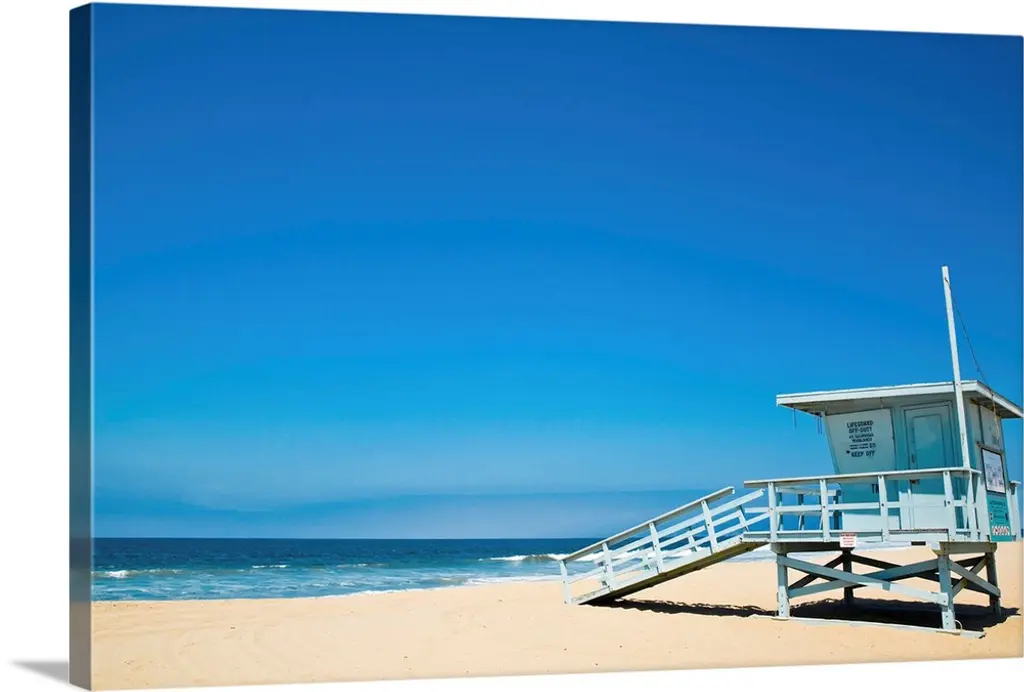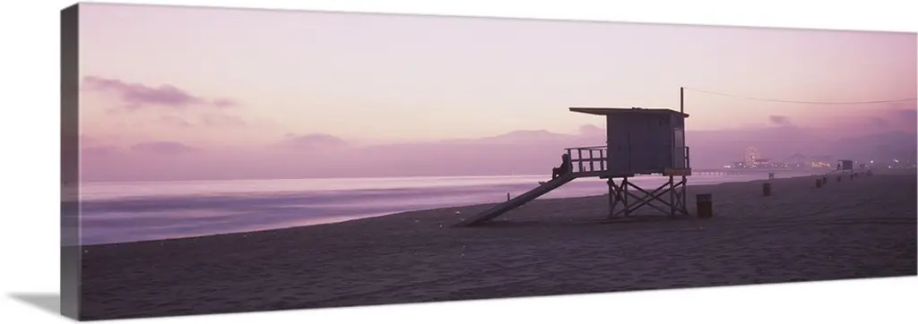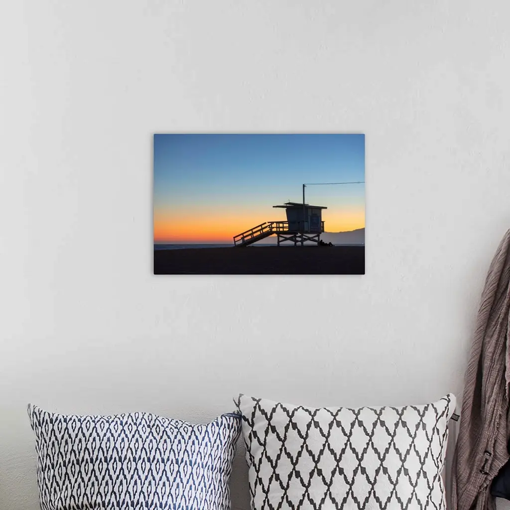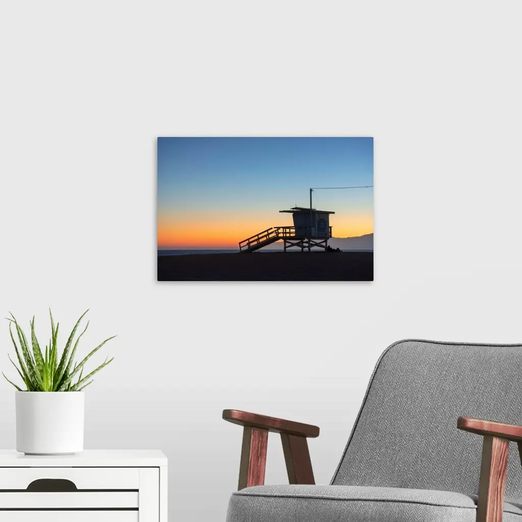The sun sets on Venice beach with the silhouette of a lifeguard tower.